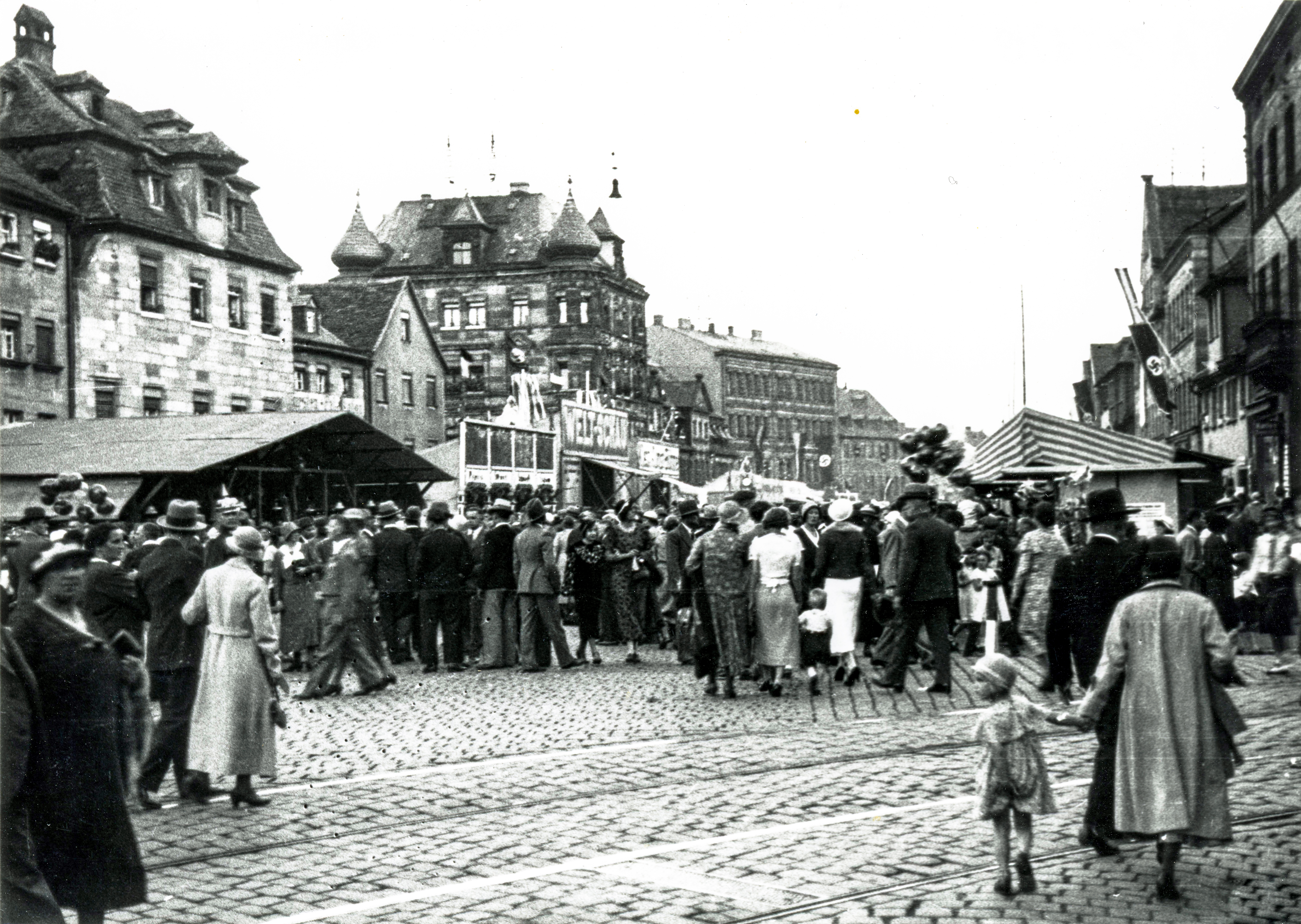 | Beschreibung | Schausteller-Buden während der Kärwa in der Königstraße, 1934 | ||