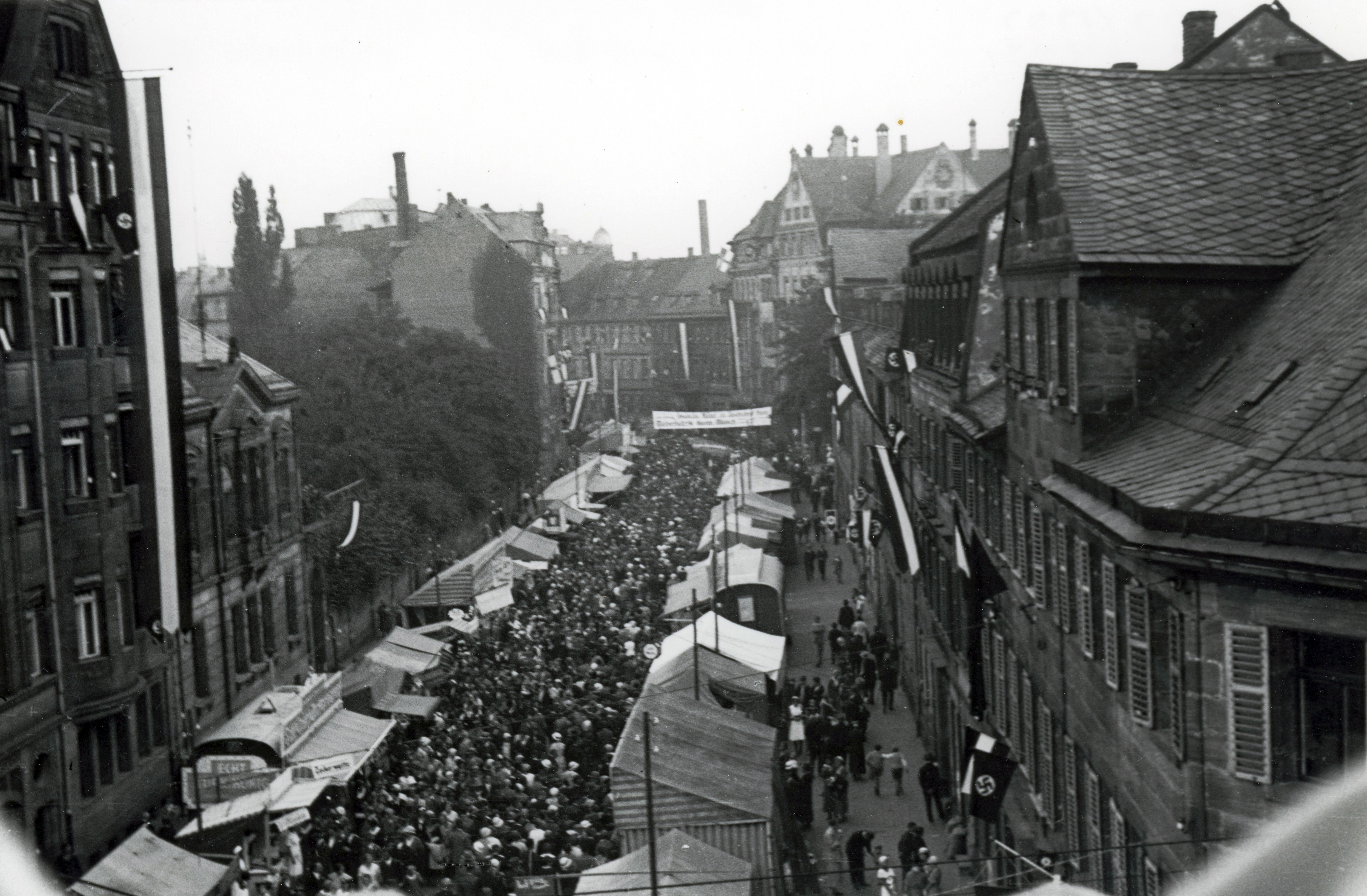 | Beschreibung | Blick in die Königstraße von der Kirche Zur unseren lieben Frau während der Kirchweih, 1936 | ||