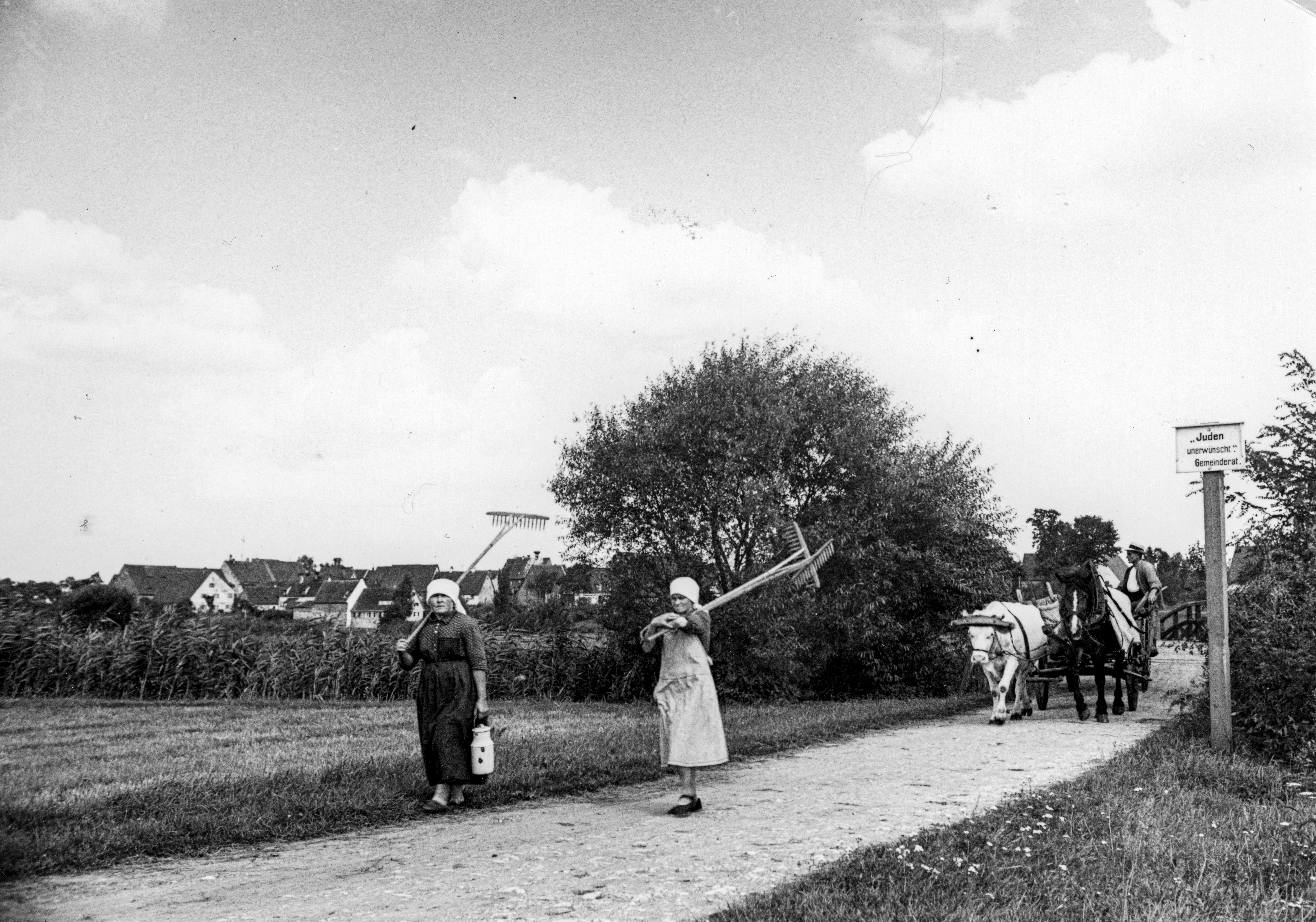 | Beschreibung | Auf dem Weg zum Heuwenden - im Bild Familie Küttlinger. Rechts im Bild ein Schild mit der Aufschrift: "Juden unerwünscht" Gemeinderat, ca. 1940 | ||