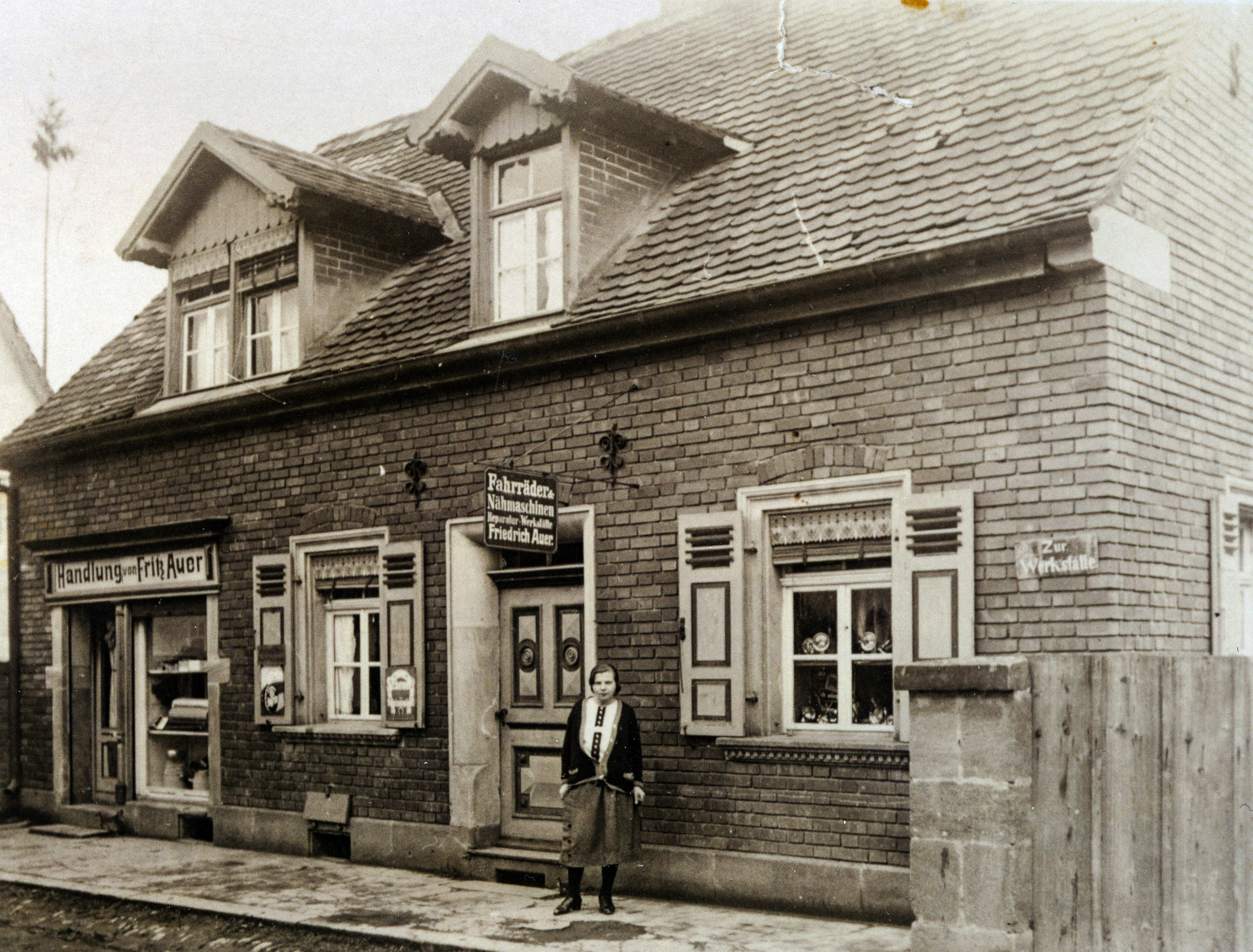 | Beschreibung | Fahrradhandlung von Friedrich (Fritz) Auer, später Grete Müller Spezereihandlung, im Bild Fr. Süss | ||