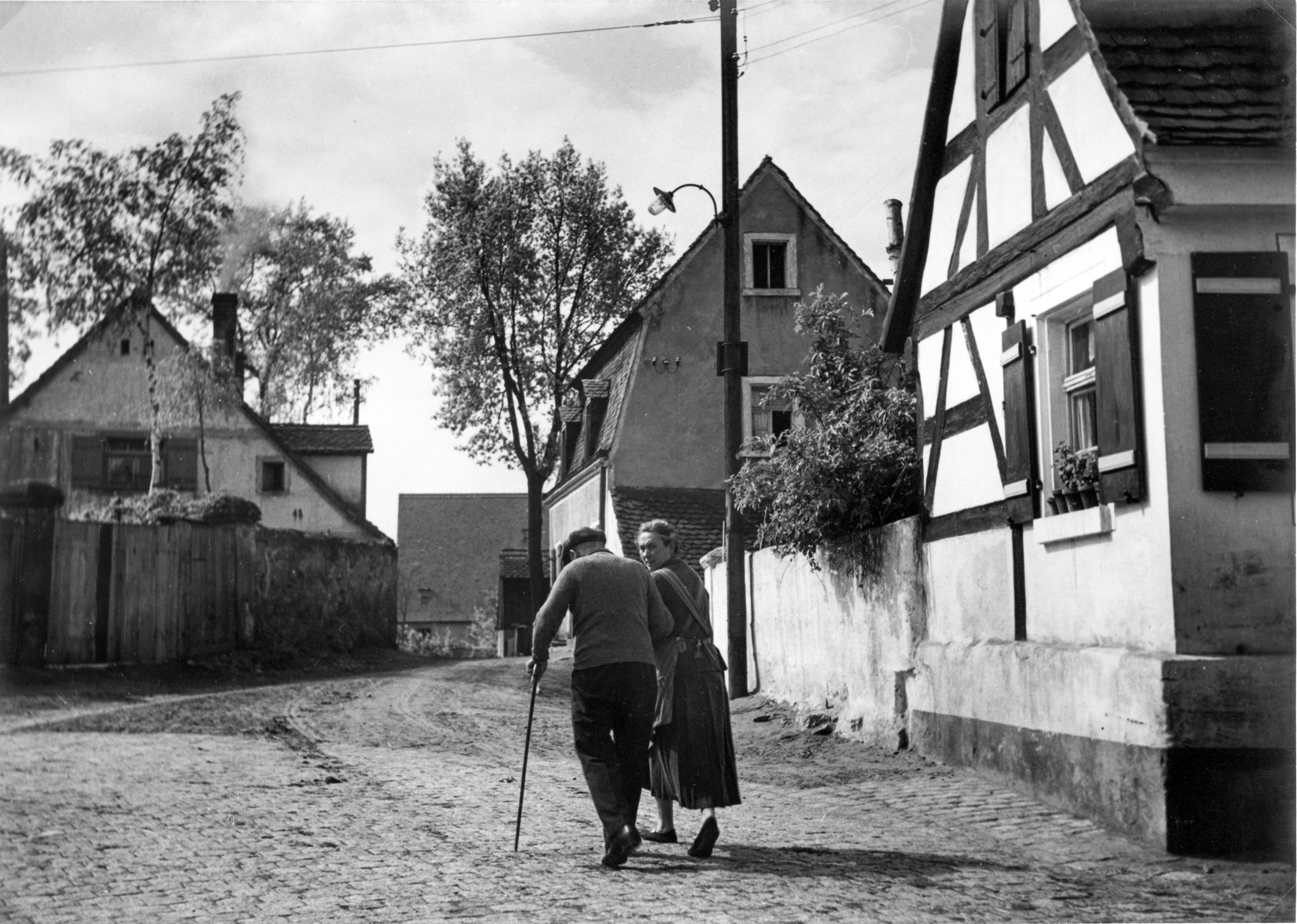 | Beschreibung | Die Gasse zum Bauernhof Schrems, im Bild Michael Frosch mit Frau Reta, ca. 1935 | ||