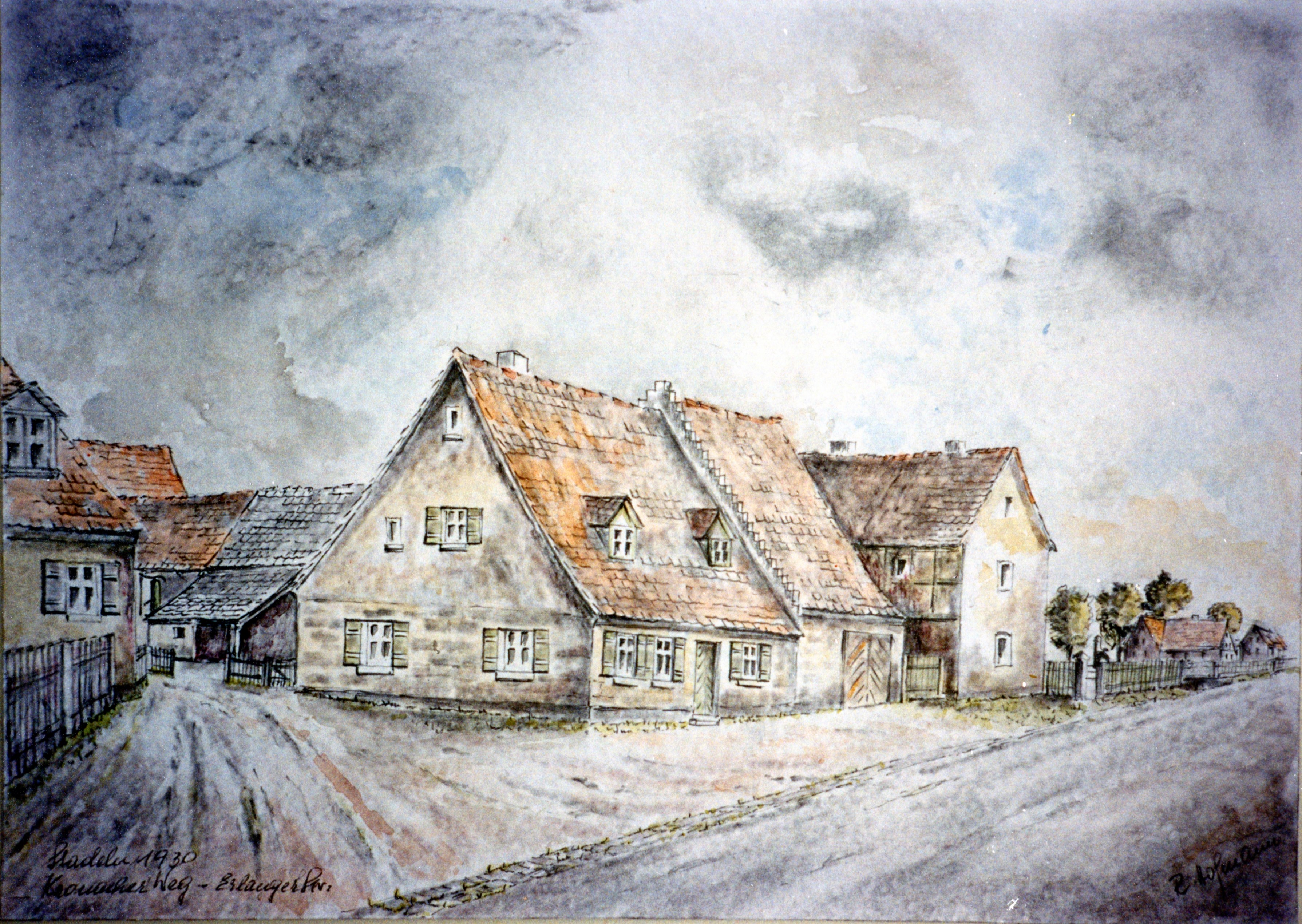 | Beschreibung | Gemälde von Rudolf Hofmann von 1930 mit Einfahrt Kronacher Weg heute Gebrüder-Grimm-Straße von der Stadelner Hauptstraße aus. Gebäude links heute Gebrüder-Grimm-Straße 1, Bildmitte Stadelner Hauptstraße 76 und rechts Stadelner Hauptstraße 72 das Ulrich Haus, das heute noch steht. | ||