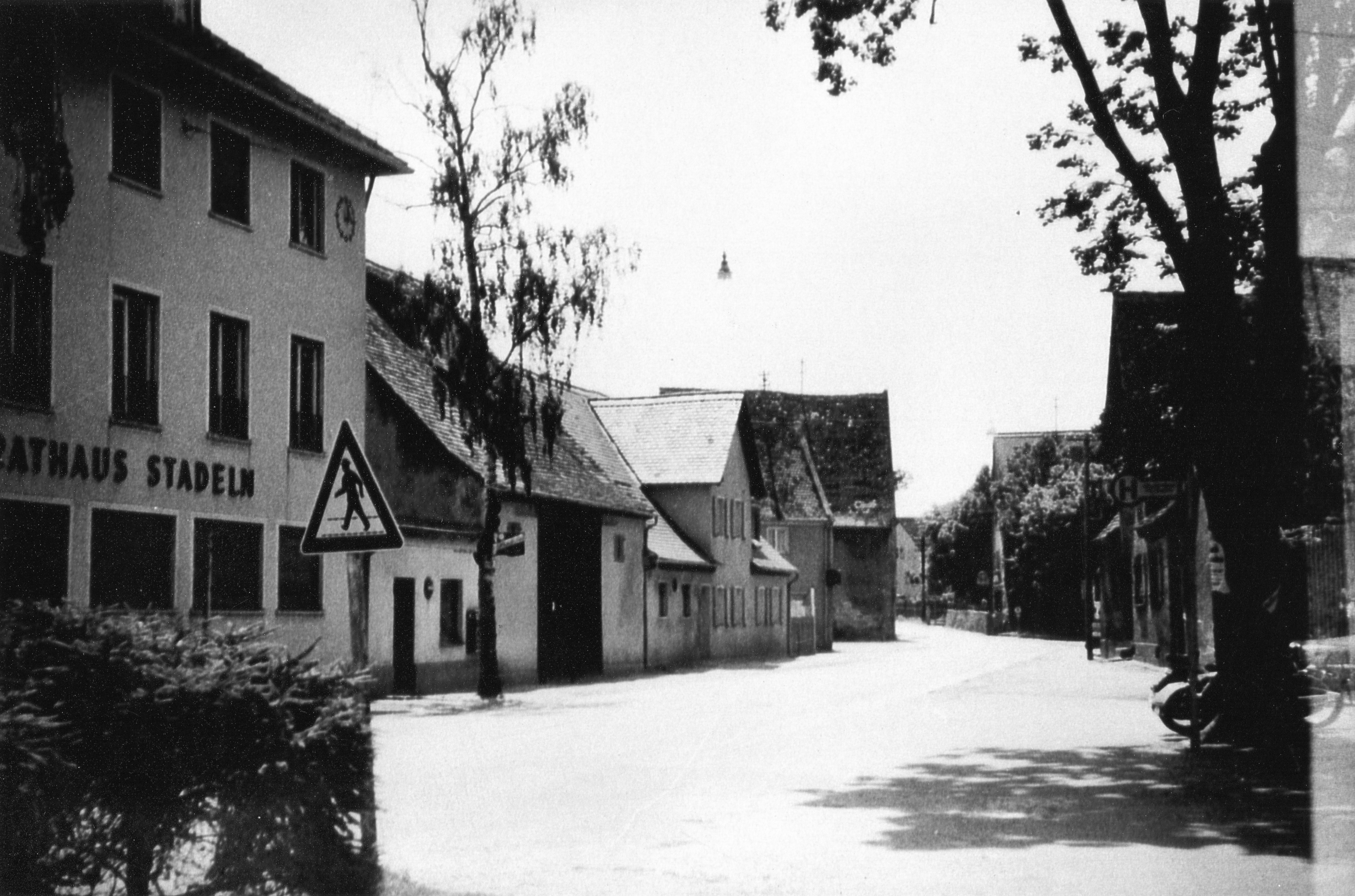 die nördliche Ortseinfahrt von Stadeln an der Stadelner Hauptstraße. Links das damalige Rathaus und heutige Bürgeramt Nord, daneben Lebensmittelgeschäft Zaschke, der auch für die Pausenverpflegung der abgerissenen Gemeinschaftsschule Stadeln (Bretzel 10 Pfennige, Wurstsemmel 30 Pfennige) zuständig war. Daneben Scheune und Bauernhaus Kleinlein Stadelner Hauptstraße 94 heute die Volksbücherei. Über der Herboldshofer Straße die Metzgerei Fleischmann, dahinter das mächte Gebäude der ehem. Gaststätte Zum Wilden Mann (Stadeln), heute Stadelner Hauptstraße 92. Rechts hinten das Gästehaus Kalb noch mit alter Sandsteinmauer, vorne rechts nicht sichtbar der Goldener Engel (Stadeln). Alle Gebäude bis auf Rathaus, Gästenhaus Kalb und Goldenen Engel wurden abgerissen. Aufnahme von 1958.