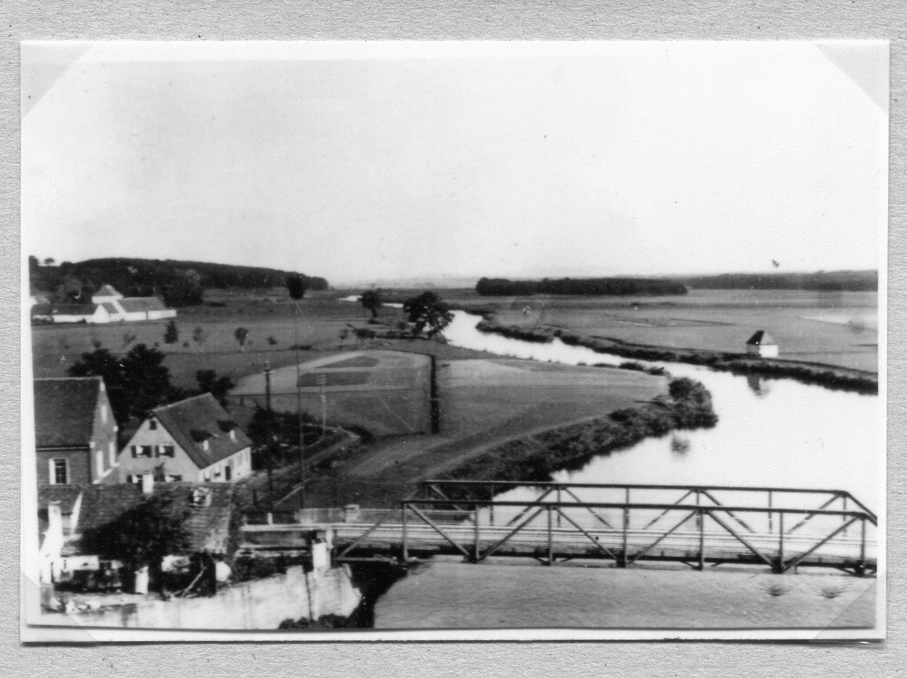 | Beschreibung | Blick auf die alte 1945 gesprengte Fachwerkbrücke s. u. Vacher Regnitzbrücke in Vach und Regnitz Richtung Erlangen mit Pumpenhäuschen zur Wiesenbewässerung rechts, Aufnahme aus den 1930iger Jahren. | ||