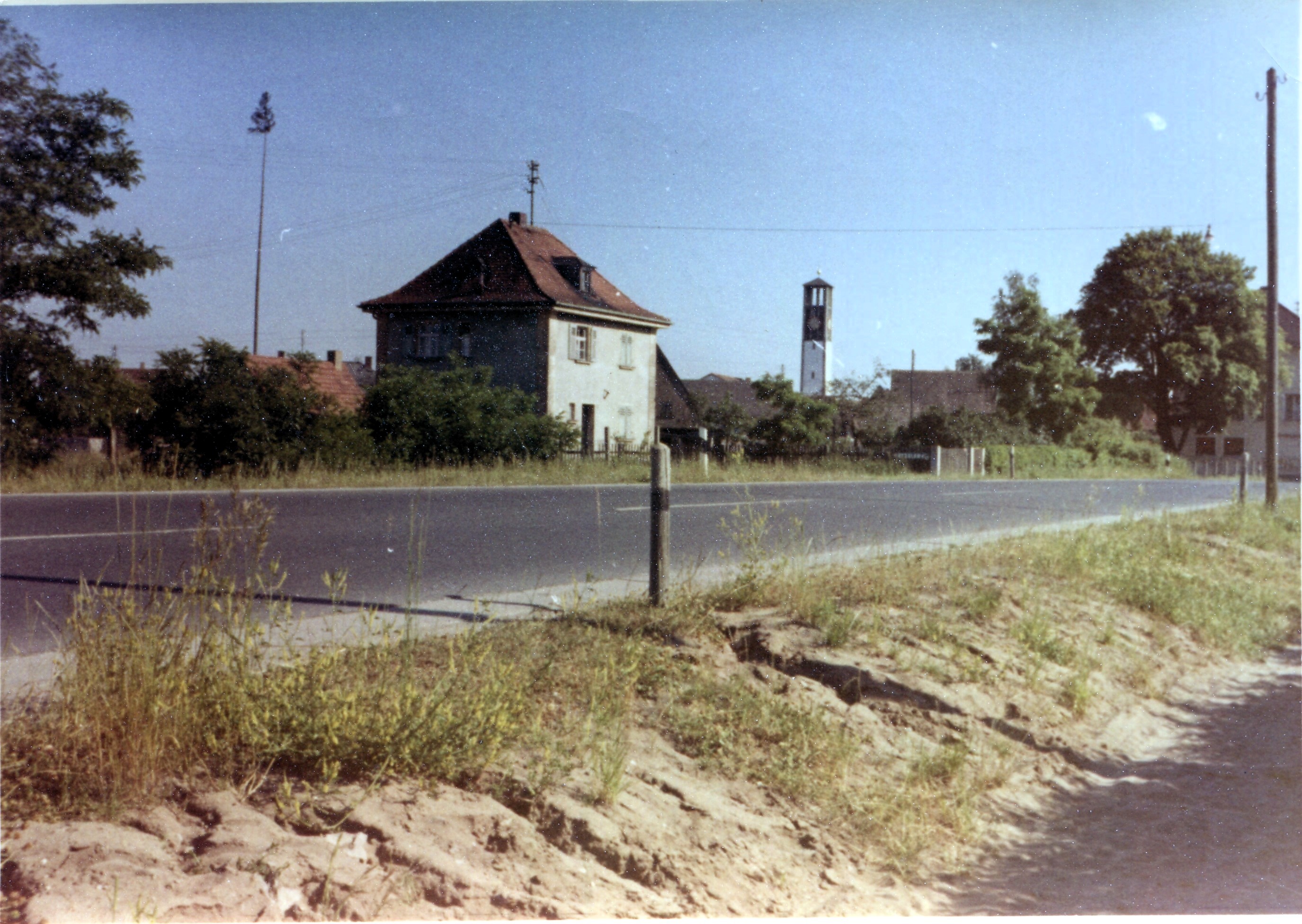 | Beschreibung | nördl. Ortseingang von Stadeln mit Walmdachgebäude Stadelner Hauptstraße 104, Turm der Christuskirche, rechts das Rathaus Stadeln Nr. 96, Aufnahme von 1960 | ||