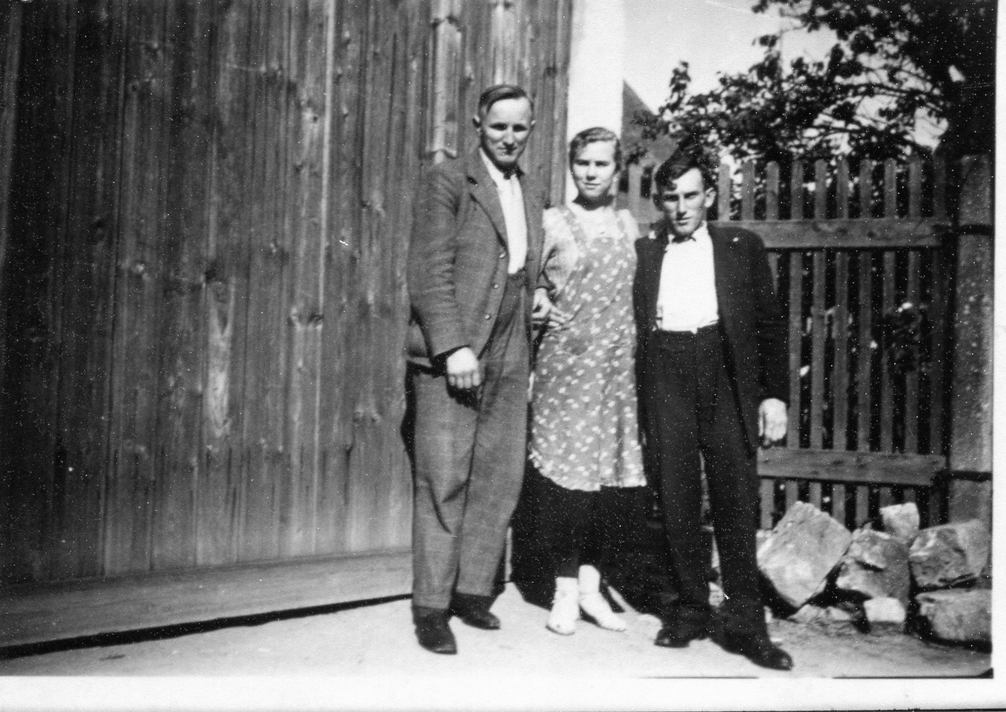 | Beschreibung | Schmied Georg Jäger Anwesen Stadelner Hauptstraße 93 mit Gunda Fleischmann geb. Dingfelder und Hanni Hofmann, langjähriger Organisator der Kirchweih Stadeln nach dem Krieg, 1959 | ||