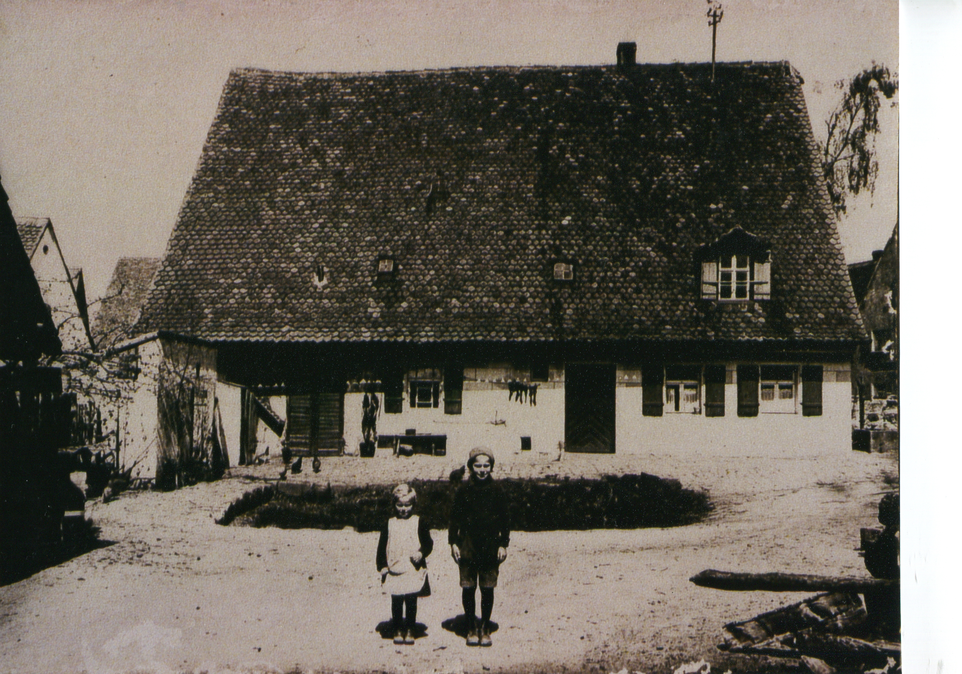 | Beschreibung | Das Muggenhöferhaus Hofseite mit den Kindern Karl und Anni | ||