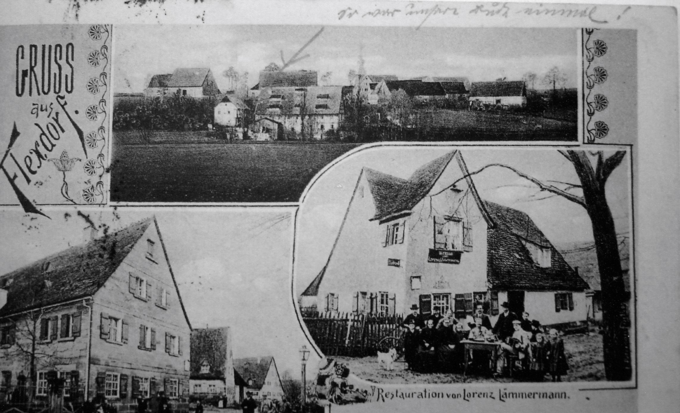 | Dateiinfo (Bild-Unterschrift und Info-Box, automatisch erstellt) | Ansichtskarte von Flexdorf mit dem Gasthaus Lorenz Lämmermann und Ortsansicht, ca. 1920 Lizenz: CC BY-SA 3.0 | ||