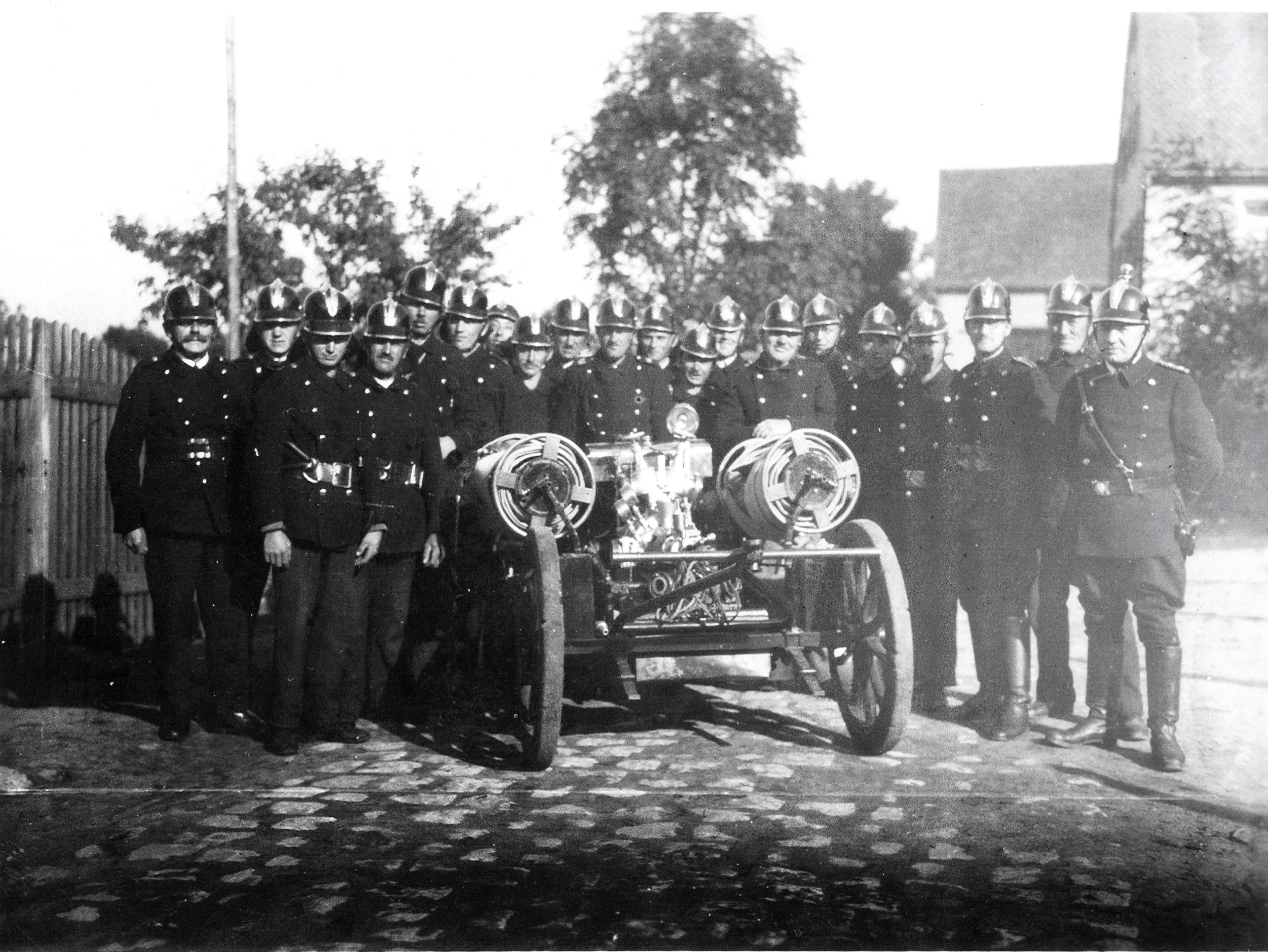 | Beschreibung | Freiwillige Feuerwehr Mannhof mit Schlauch- und Spritzenwagen ca. 1920 | ||