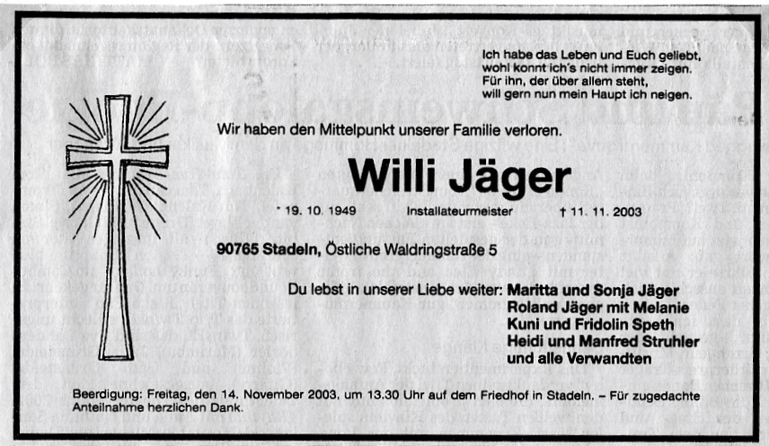 | Beschreibung | Traueranzeige für Wilhelm Jäger Nov. 2003 | ||