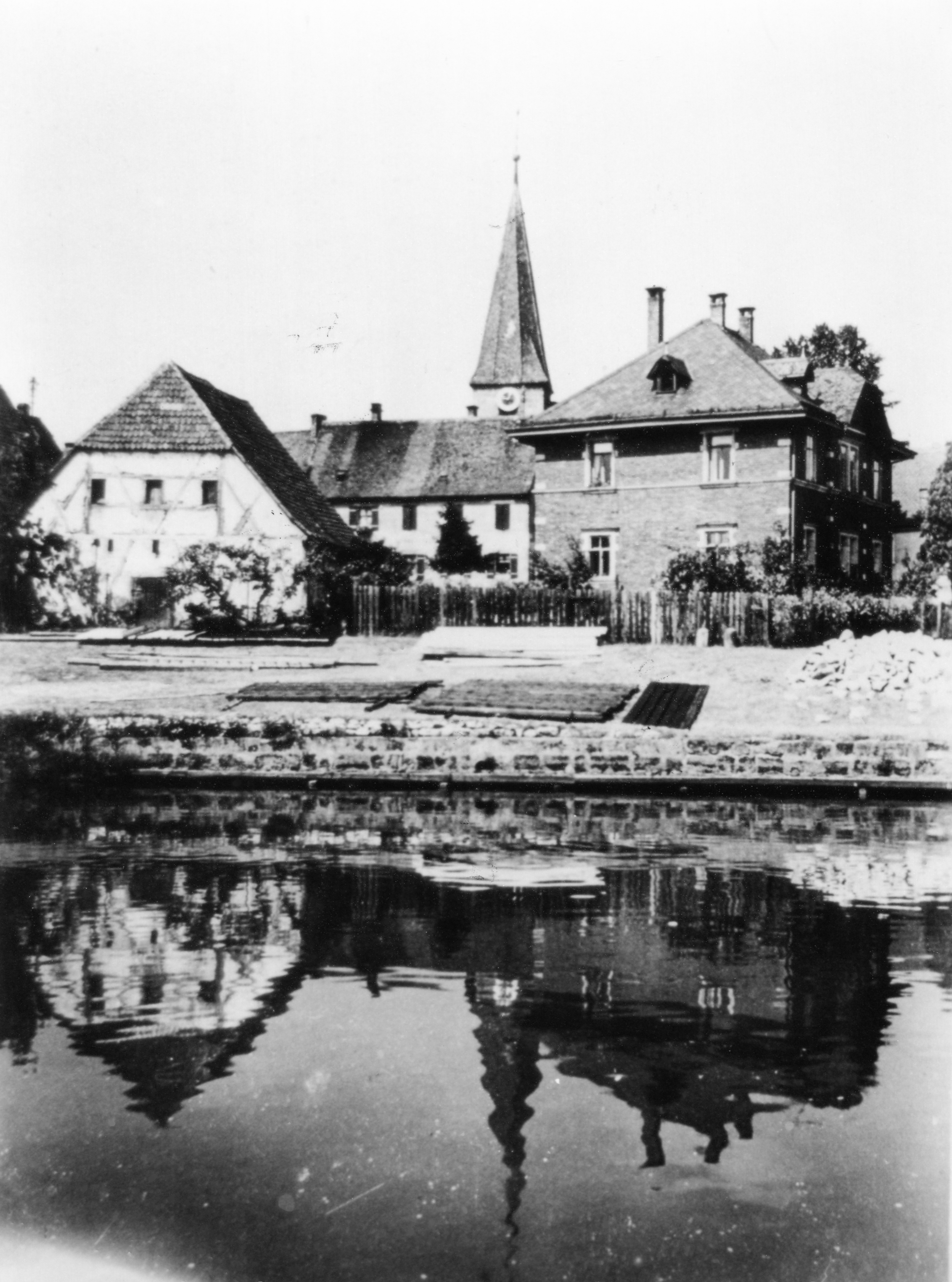 | Beschreibung | Foto vom Mühlenweiher aus mit Gebäude Kirche St. Matthäus und rechts Brückenstraße 20 ca. 1930 | ||