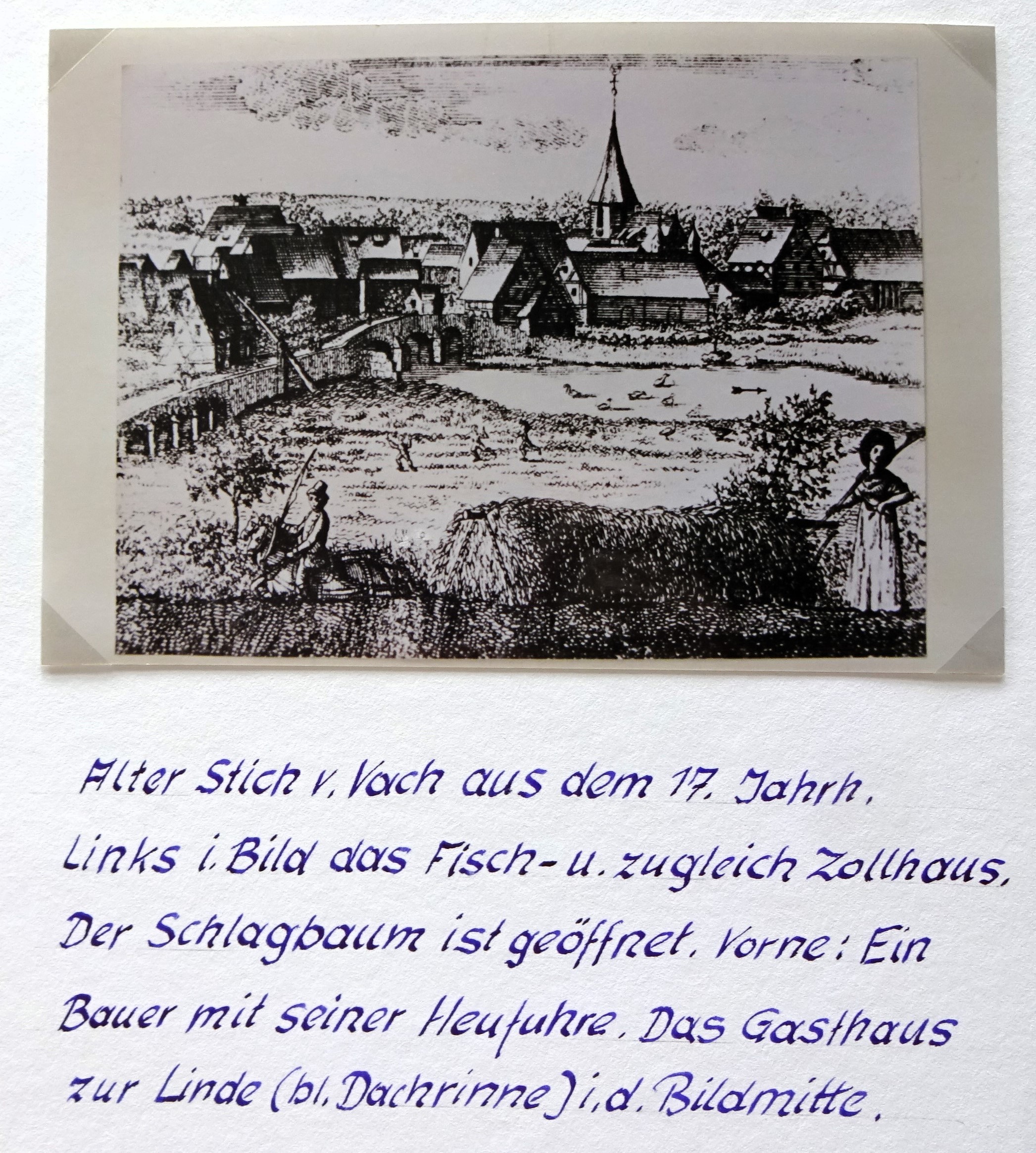 | Dateiinfo (Bild-Unterschrift und Info-Box, automatisch erstellt) | Zeichnung von Vach - von Mannhof aus - 18. Jahrhundert mit Zollstation Brückenstraße 24 mit ... Zeichnung von Vach - von Mannhof aus - 18. Jahrhundert mit Zollstation Brückenstraße 24 mit handschriftlichen Ergänzungen von Georg Mehl<br>Urheber: unbekannt<br><br>Lizenz: CC BY-SA 3.0 | ||
