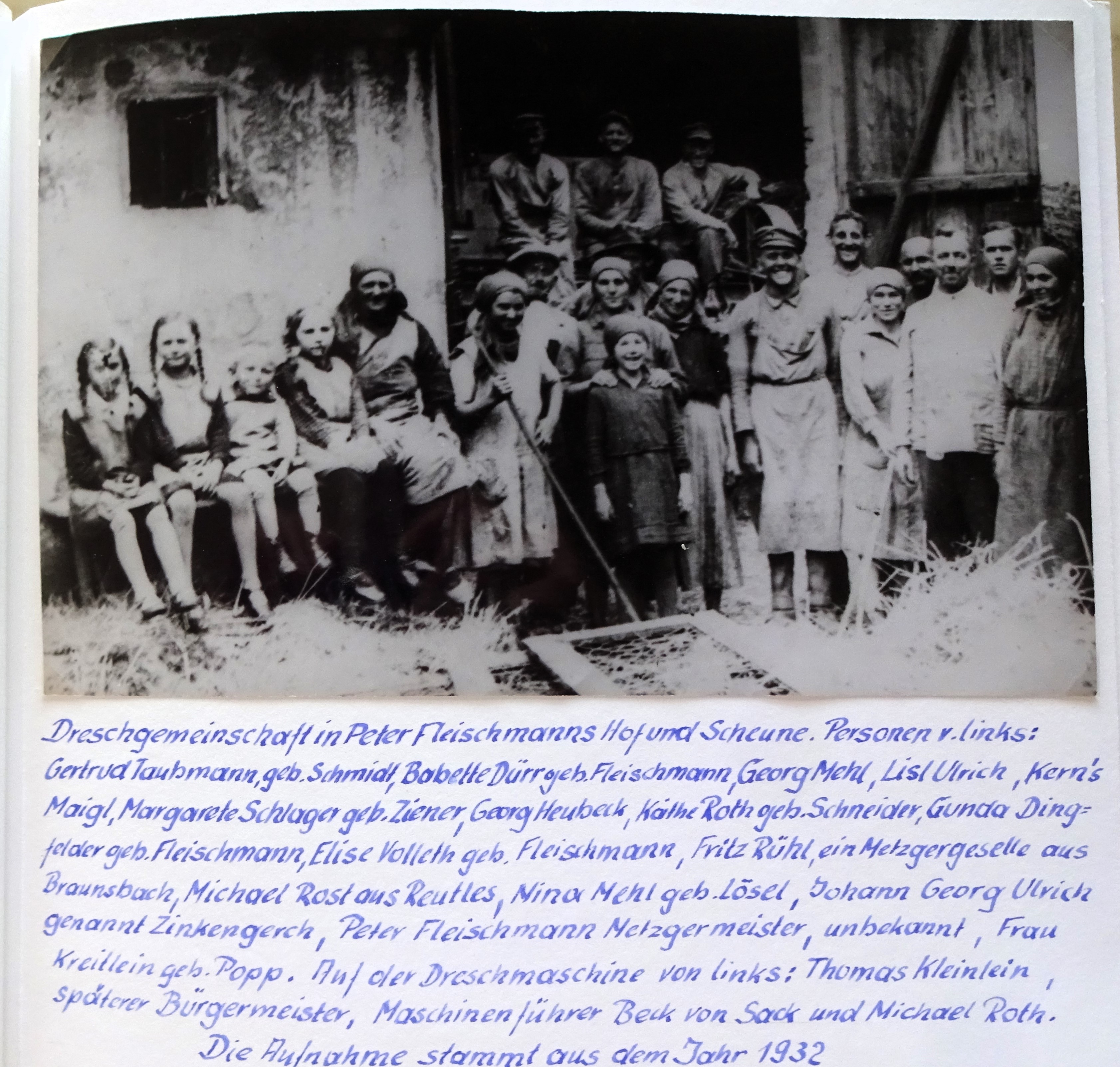 | Beschreibung | Dreschgemeinschaft Bauernhof Peter Fleischmann, heute Herboldshofer Straße 2 mit dem späteren Bürgermeister Thomas Kleinlein in Stadeln von 1932 | ||