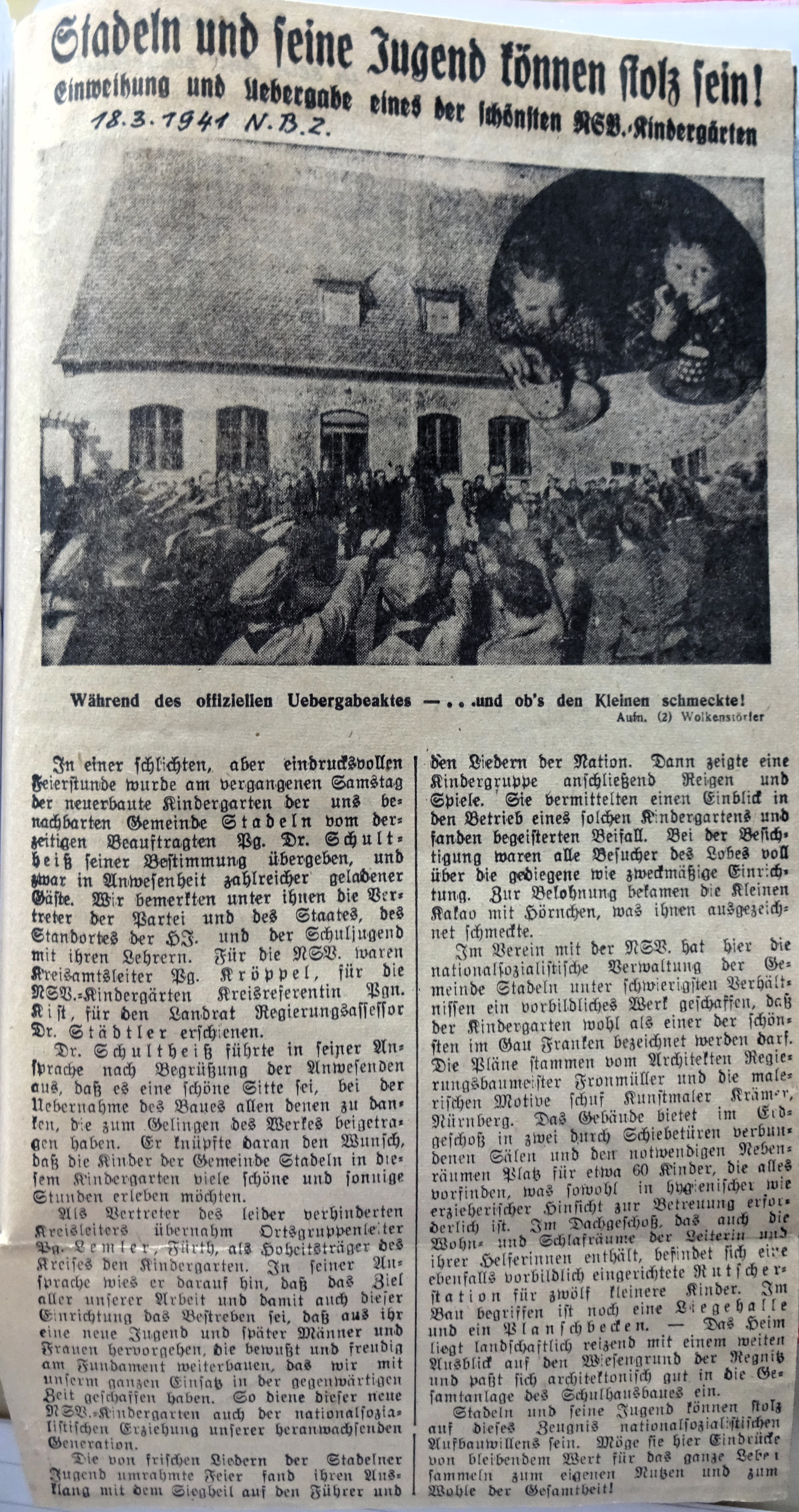 | Beschreibung | Zeitungsbericht über die Eröffnung des Kindergarten in Stadeln vom 18. März 1941 | ||