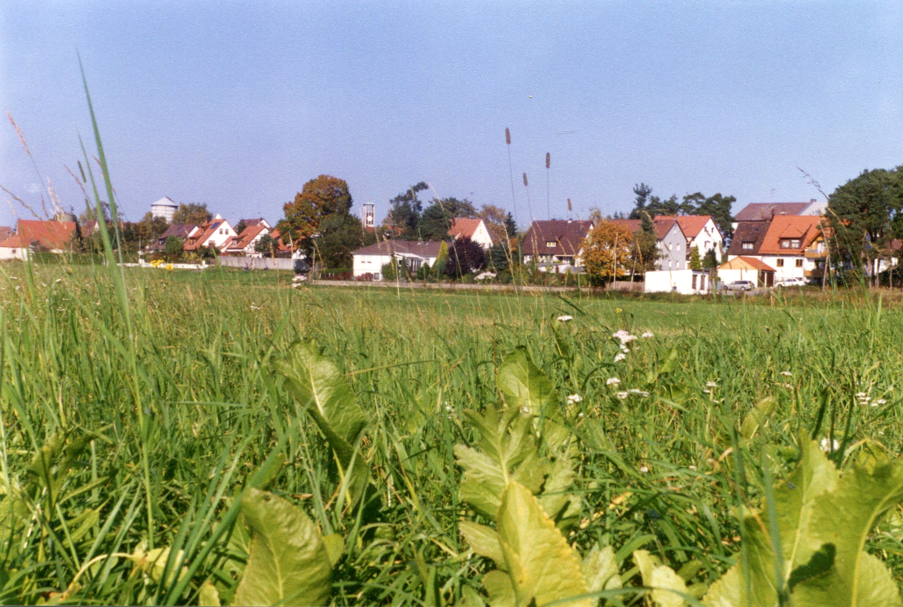 | Beschreibung | Blick vom Wiesengrund auf Stadeln Am Regnitzhang - links die landwirtschaftlichen Gebäude Schrems Romminggasse 9 und Lohbauer Stadelner Hauptstraße 67 mit Silo, Bildmitte Turm der Christuskirche, 1996 | ||