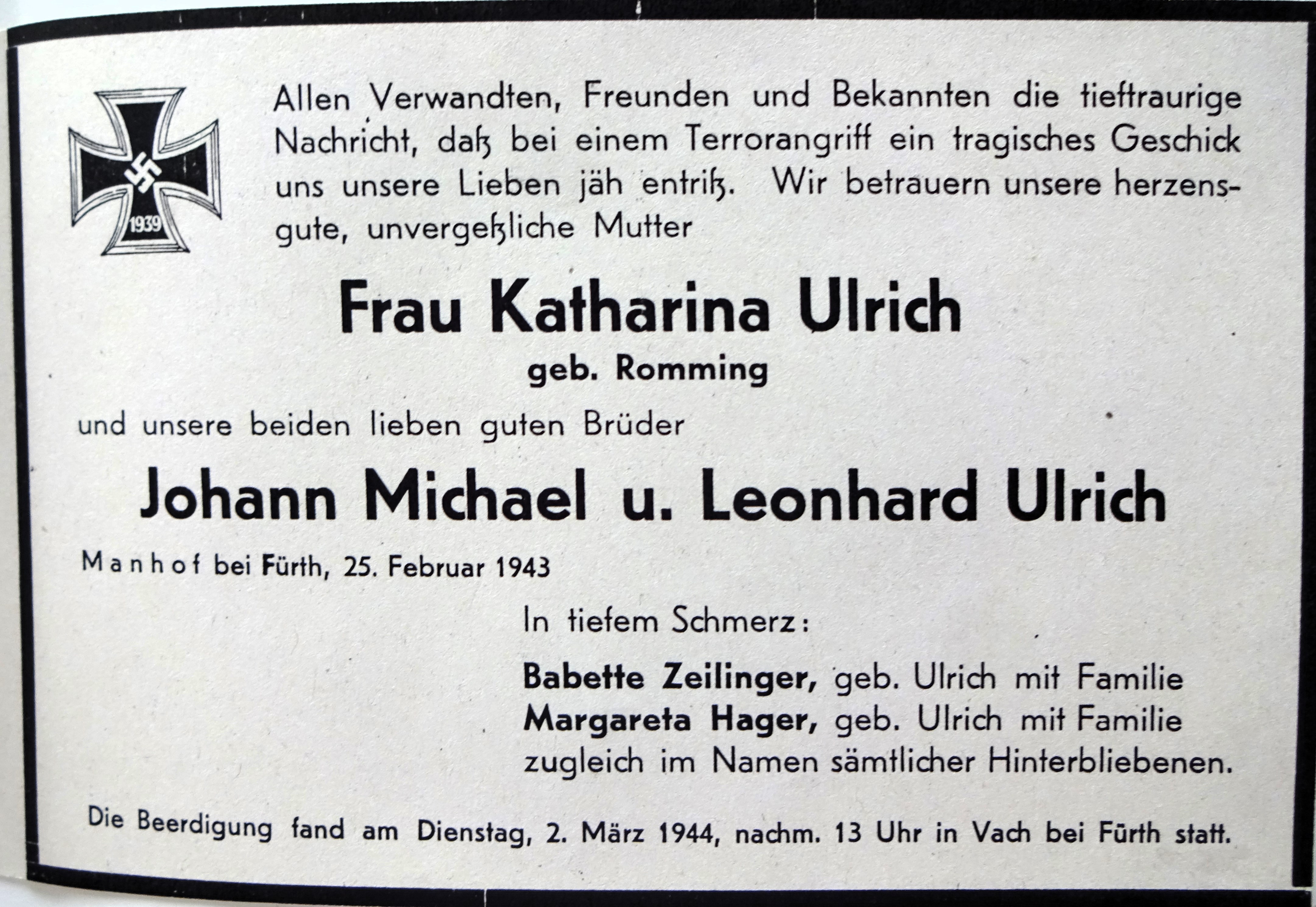 | Beschreibung | Todesanzeige der 3 Bombenopfer der Familie Ulrich verursacht durch die komplette Zerstörung des Bauernhofes in Mannhof am 26. Februar 1943 | ||