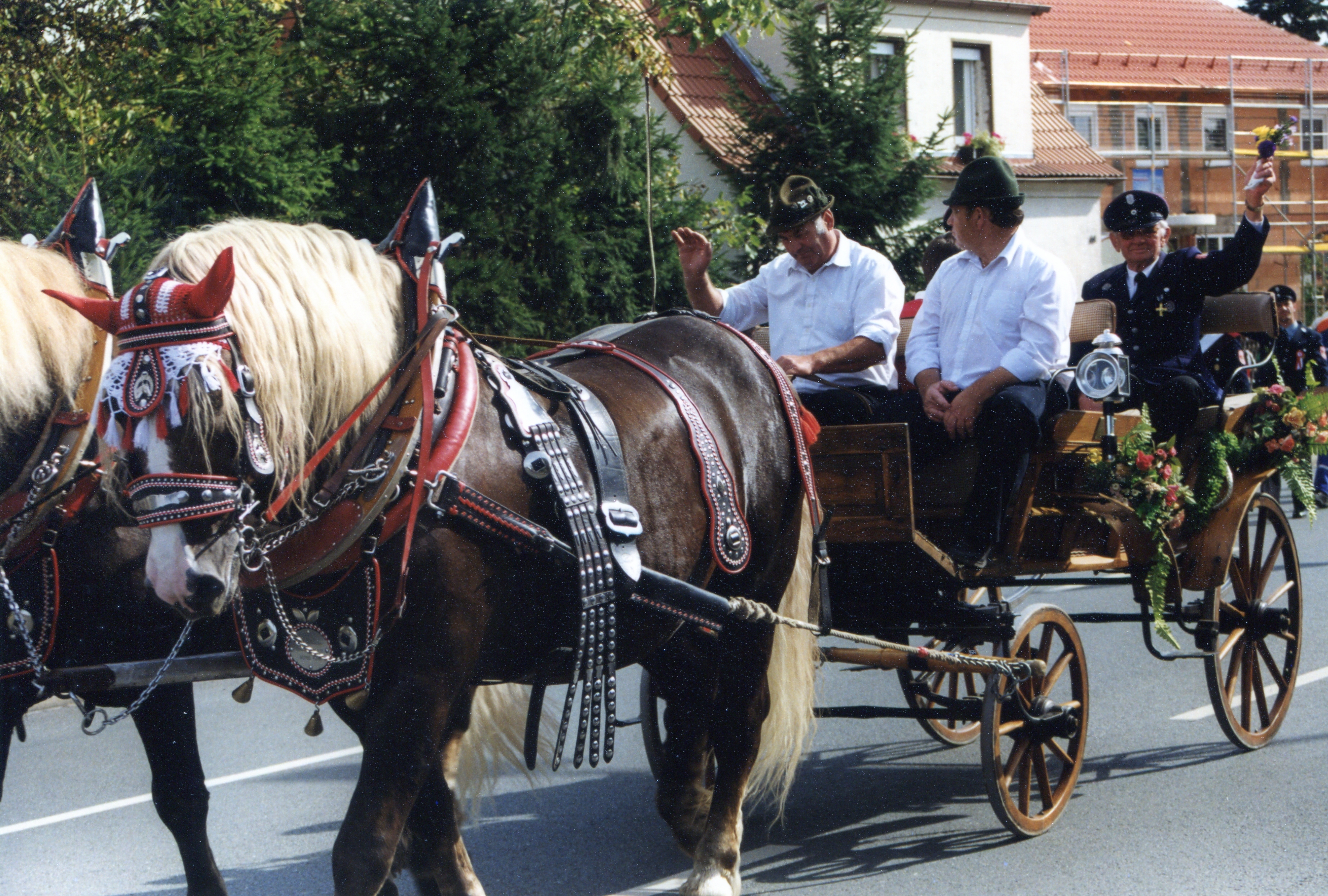 | Beschreibung | 125jähriges Gründungsfest der FFW Stadeln. Festzug in der Stadelner Hauptstraße mit 2 PS und FFW Veteran Andreas Feiertag (60 Jahre Mitglied), 27. September 1998 | ||
