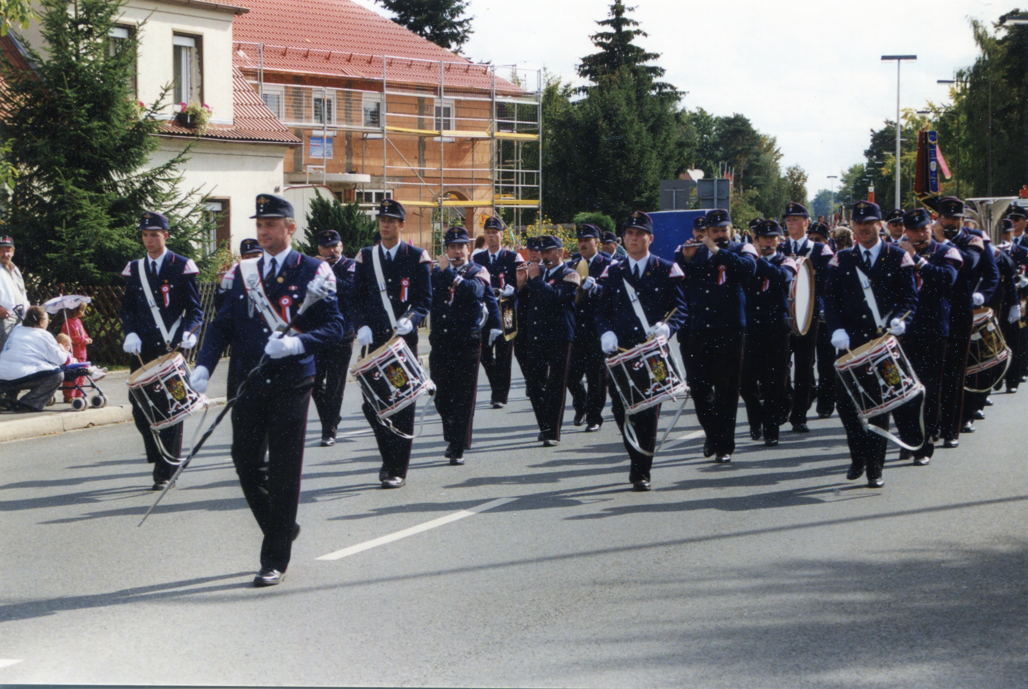 | Beschreibung | 125jähriges Gründungsfest der FFW Stadeln. Festzug in der Stadelner Hauptstraße mit Spielmannzug des Patenvereins der FFW Überlingen am Bodensee, 27. September 1998. Im Hintergrund Neubau vom künftigen Restaurant Alexander der Große. | ||