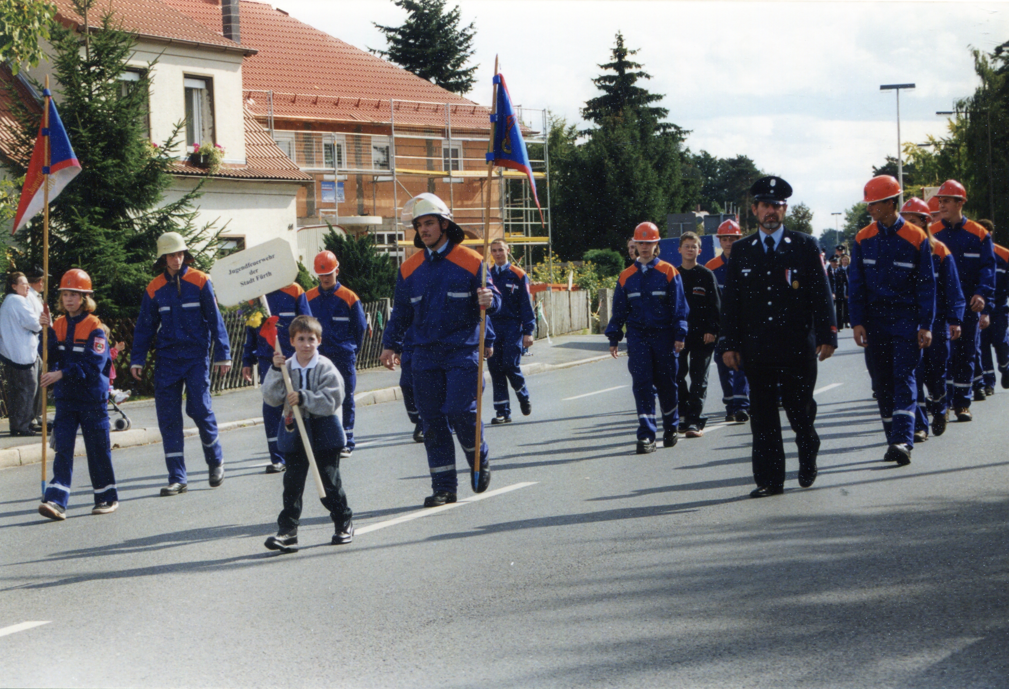 | Beschreibung | 125jähriges Gründungsfest der FFW Stadeln. Festzug in der Stadelner Hauptstraße mit der Jugendfeuerwehr der Stadt Fürth, 27. September 1998 | ||
