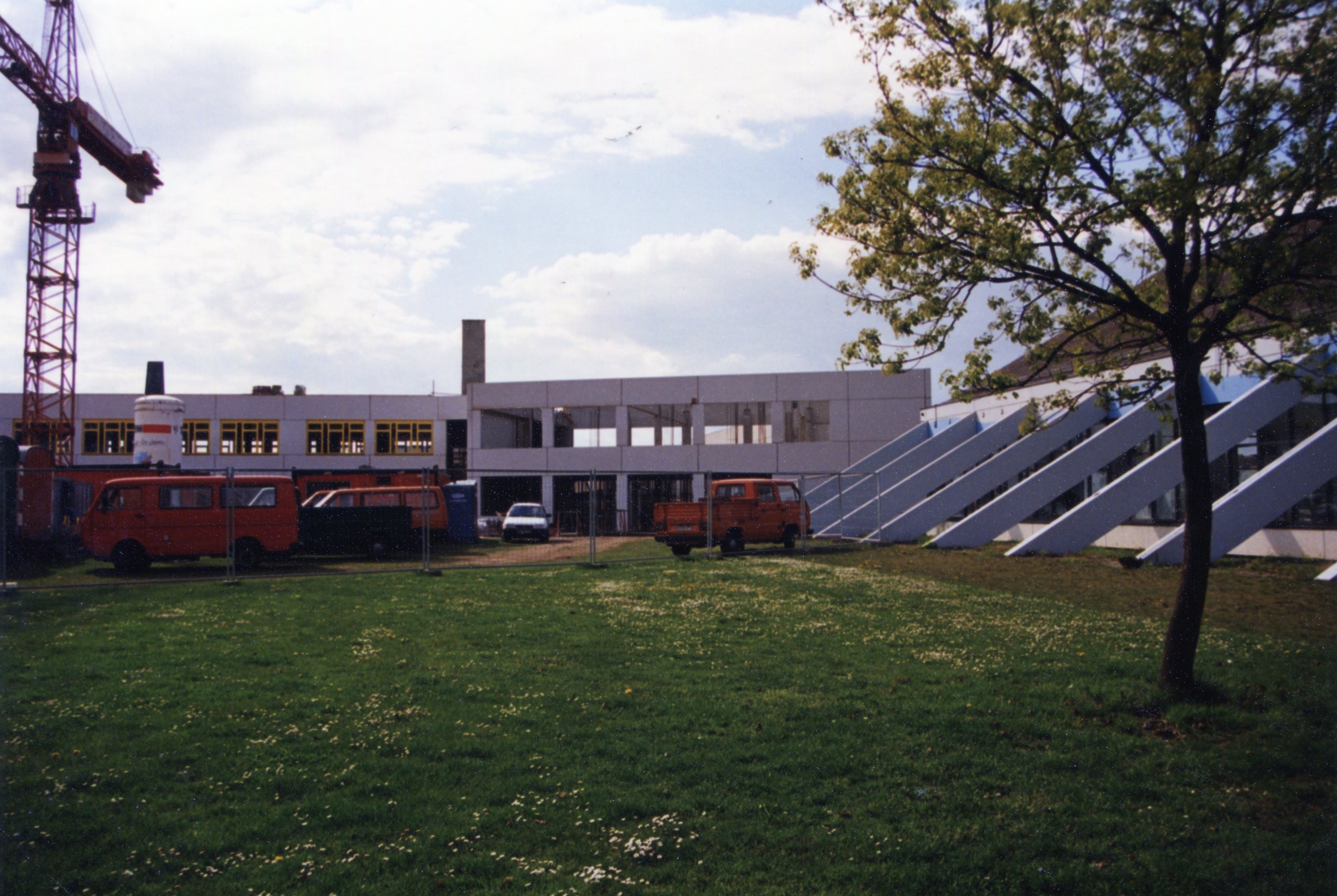| Beschreibung | Neubau des Schulzentrums Hans-Sachs-Straße, rechts das Hallenbad Stadeln, 1998 | ||