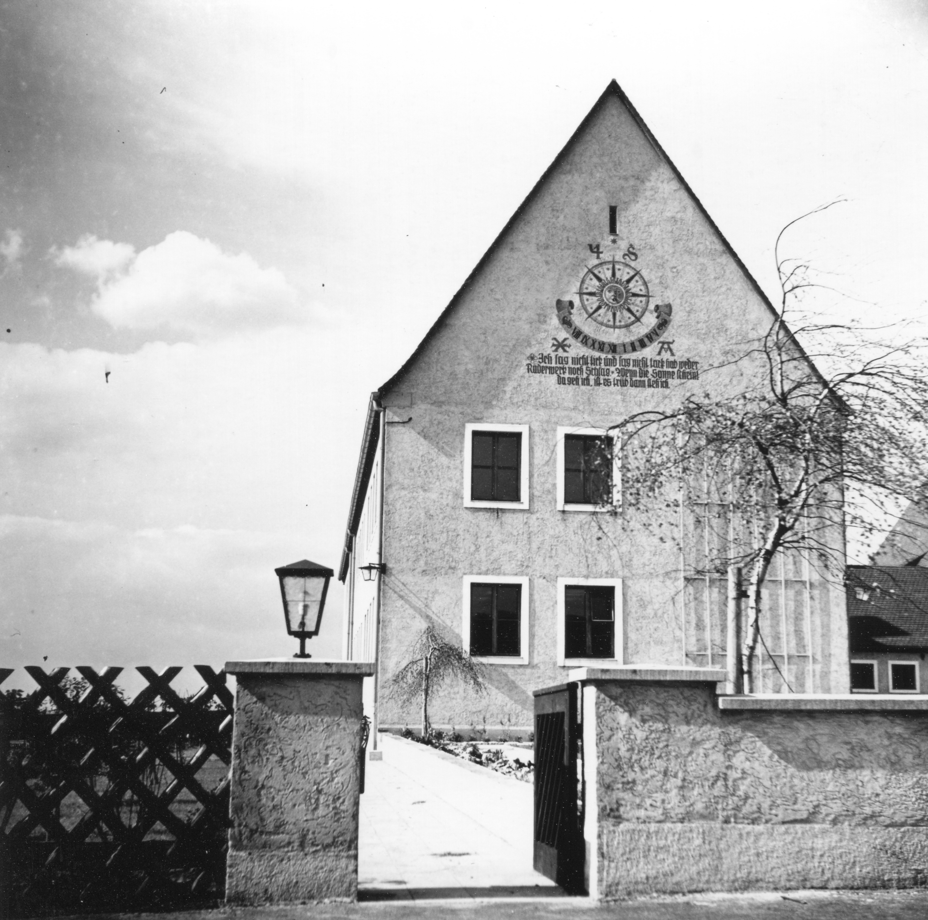 | Beschreibung | Giebel mit Sonnenuhr am neuen Schulhaus von der heutigen Karl-Hauptmannl-Straße aus im Jahr 1940 | ||