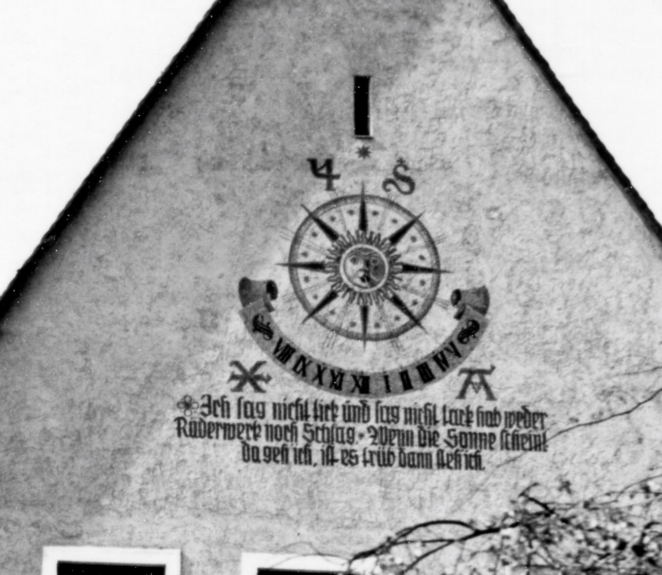 | Beschreibung | Schmuck an öffentlichen Gebäuden - Giebel mit Sonnenuhr am neuen Schulhaus Stadeln 1940. Später wurde der Dachraum als Klassenzimmer benötigt und an dieser Giebelstelle 4 Fenster eingebaut. Die Sonnenuhr wurde damit zerstört. | ||