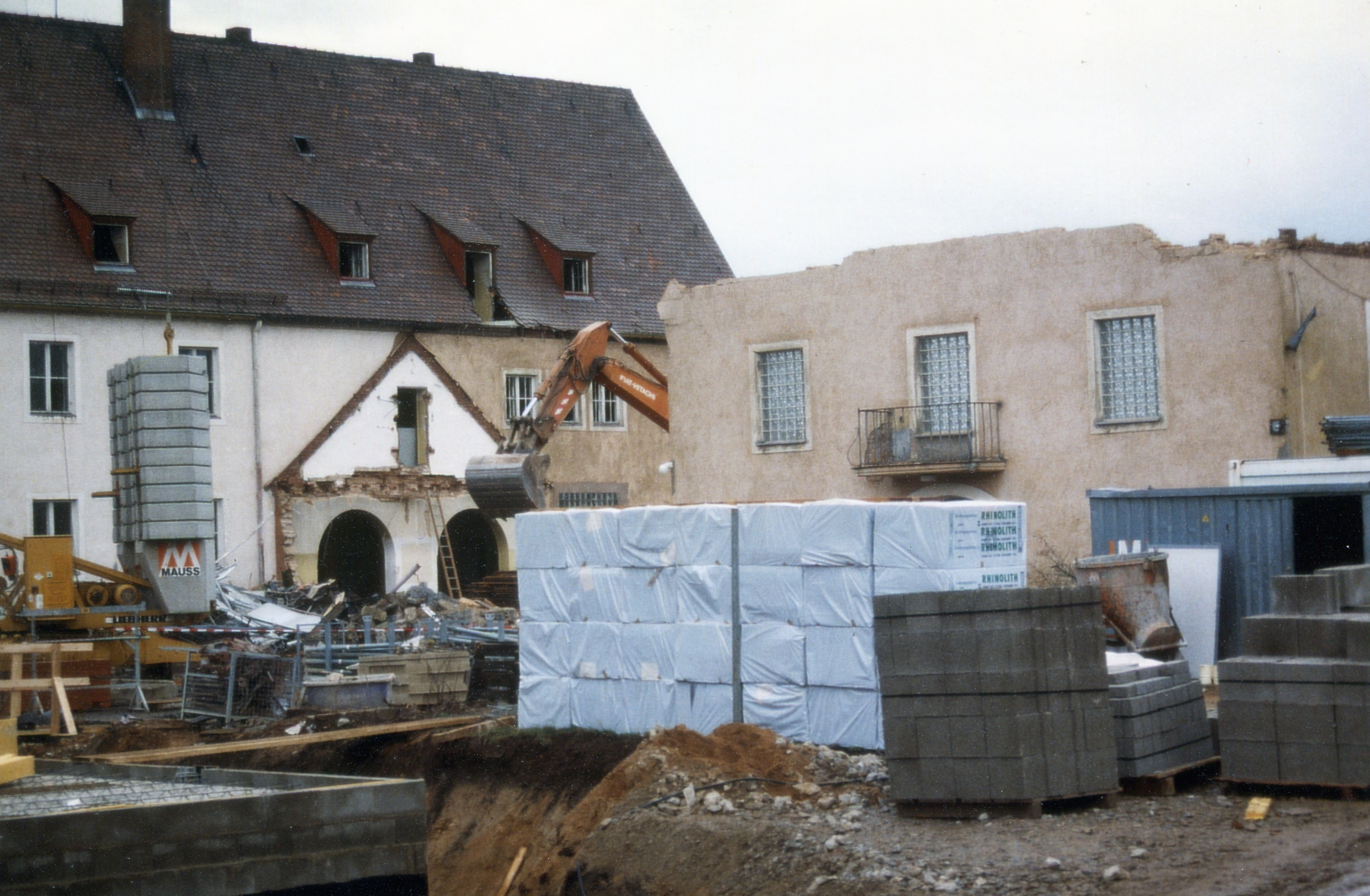 | Beschreibung | Abriss der Gemeinschaftsschule Stadeln, Verbindungsbau weg, Kontur der Doppelbögen ehem. Zugang von der Vorhalle zum Schulhaus, Turnhalle halb abgetragen. Vorne entstehen schon die neuen Gebäude, August 1999 | ||