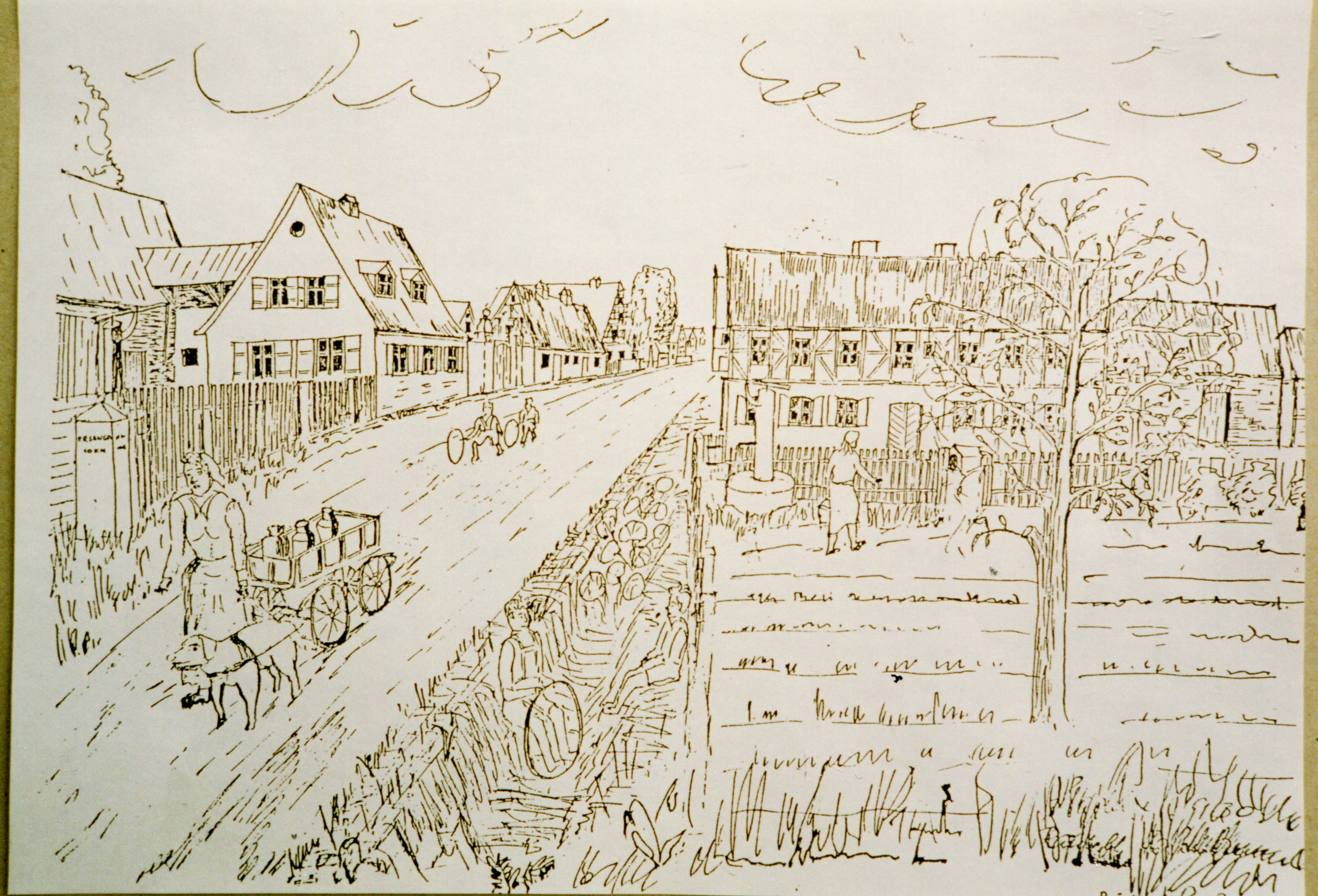 | Beschreibung | Federzeichnung Frau mit Milchkannenwagen mit eingespannten Hund auf den Weg nach Fürth 1900. Links Gebäude Büchel bis zum Muggenhöferhaus. Die Hunde mussten aus "Sicherheitsgründen" beim Schmied Stenz in Fürth eingestellt werden (lt. Großmutter von Georg Mehl). | ||