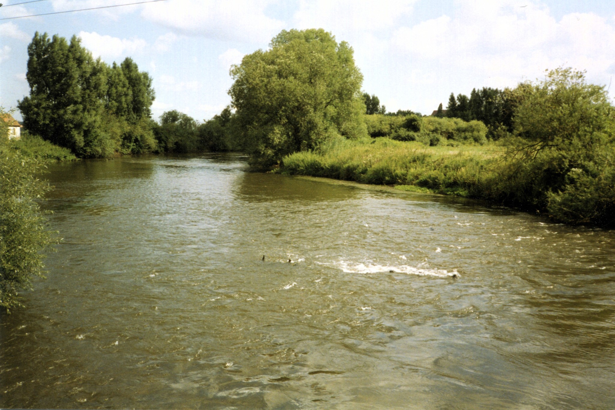 | Beschreibung | Die Regnitz Richtung Norden von der Heubrücke (Stadeln) aus. Einige Pfosten im Wasser zeigen eine frühere hölzerne Stauwand an für die Strömungsverstärkung zu einem ehem. Wasserrad am linken Ufer. Originalfoto vom Wasserrad 1936 neben an. Das Pumpenhäuschen übernimmt heute diese Aufgabe. Aufnahme von 1980 | ||