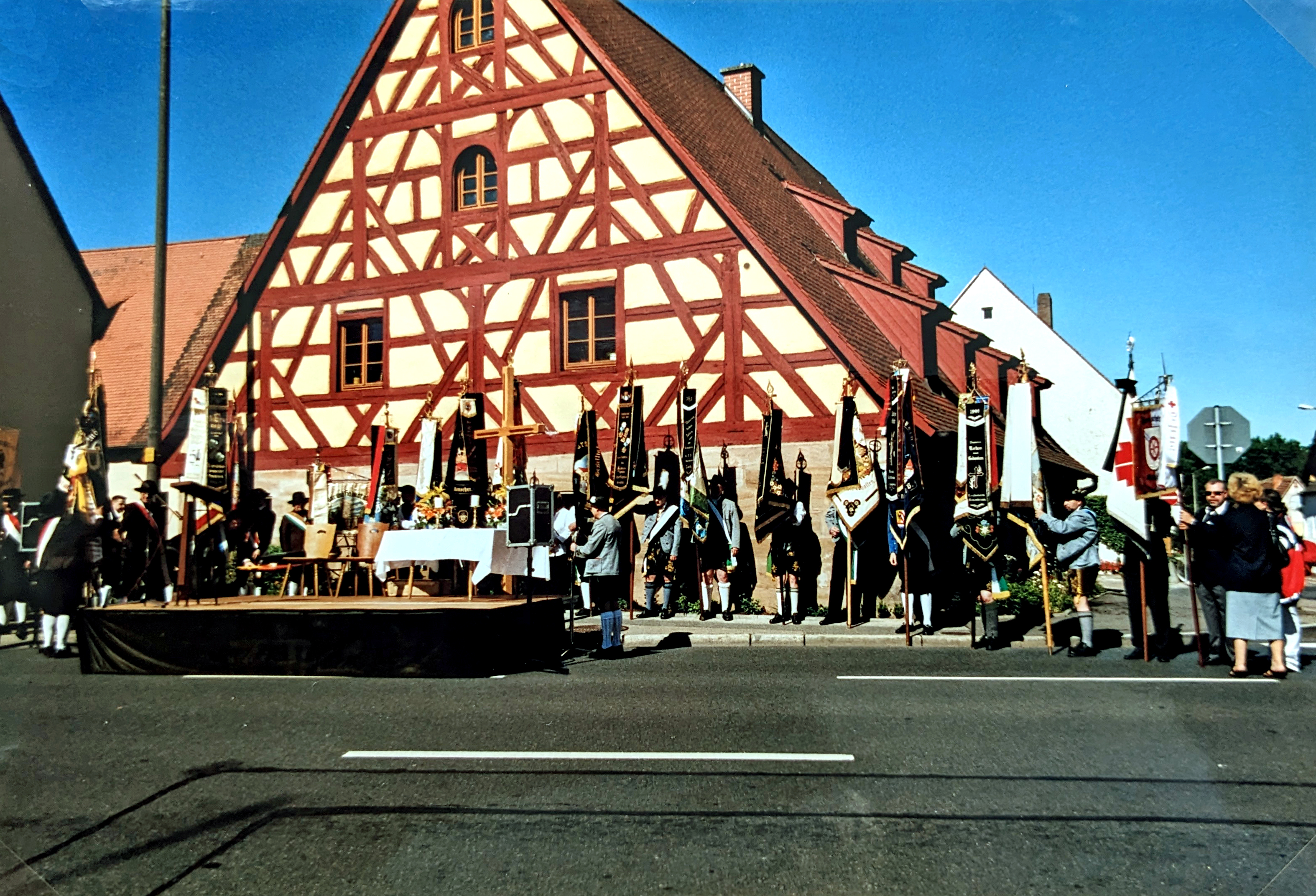 | Beschreibung | Fahnen und Standarten nehmen Aufstellung beim 40-jährigen Gründungsfest des Heimat- und Trachtenvereins in Stadeln, 2005 | ||