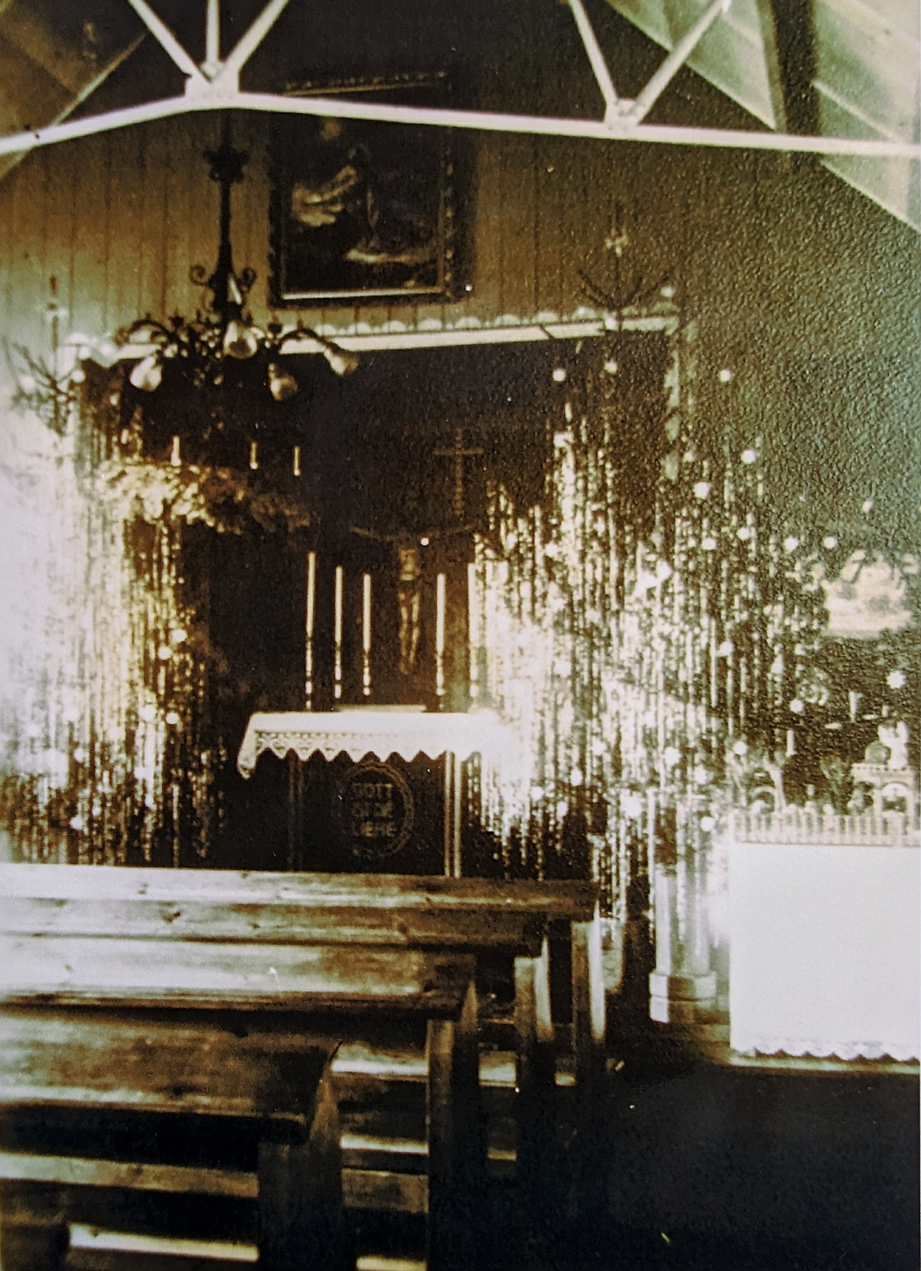 | Beschreibung | Innenansicht der alten Christuskapelle Stadeln die 1957 für die neue Kirche abgerissen wurde, etwa 1956. | ||
