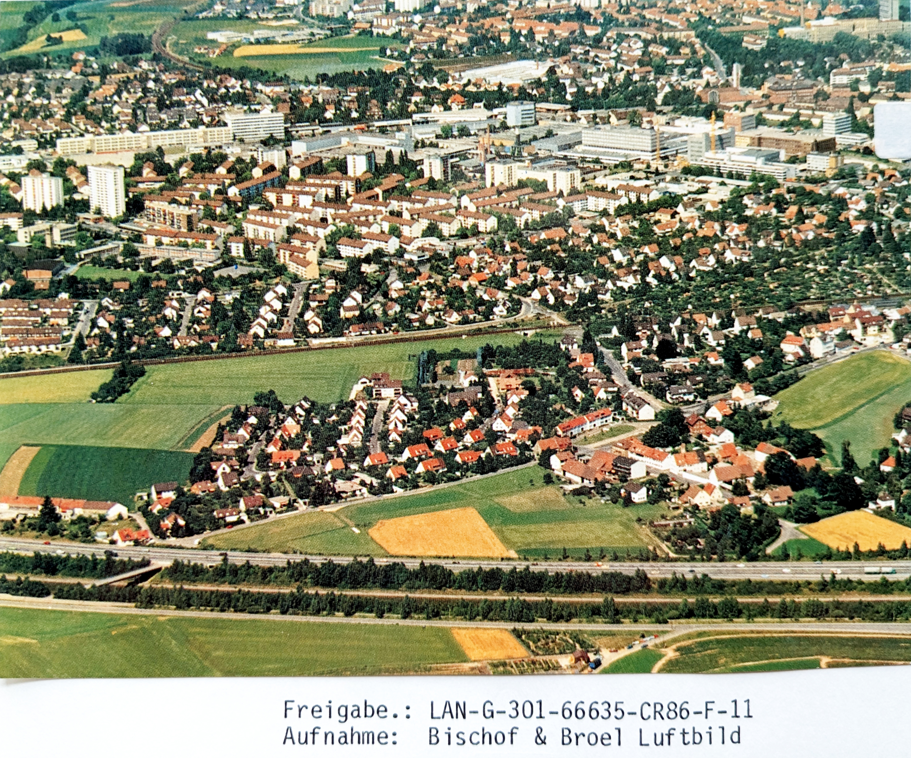 Die Fundstelle befindet sich noch etwas rechts von dem Bild an der Ecke Lehmusstraße / Hardstraße 21. Luftbildfreigabe: LAN-G-301-66635 CR86-F-11, Kundengabe der Stadtsparkasse Fürth, 1987. Aktuelle Genehmigung von Bischof & Broel vom 20. März 2023, Herr Manfred Gillert.