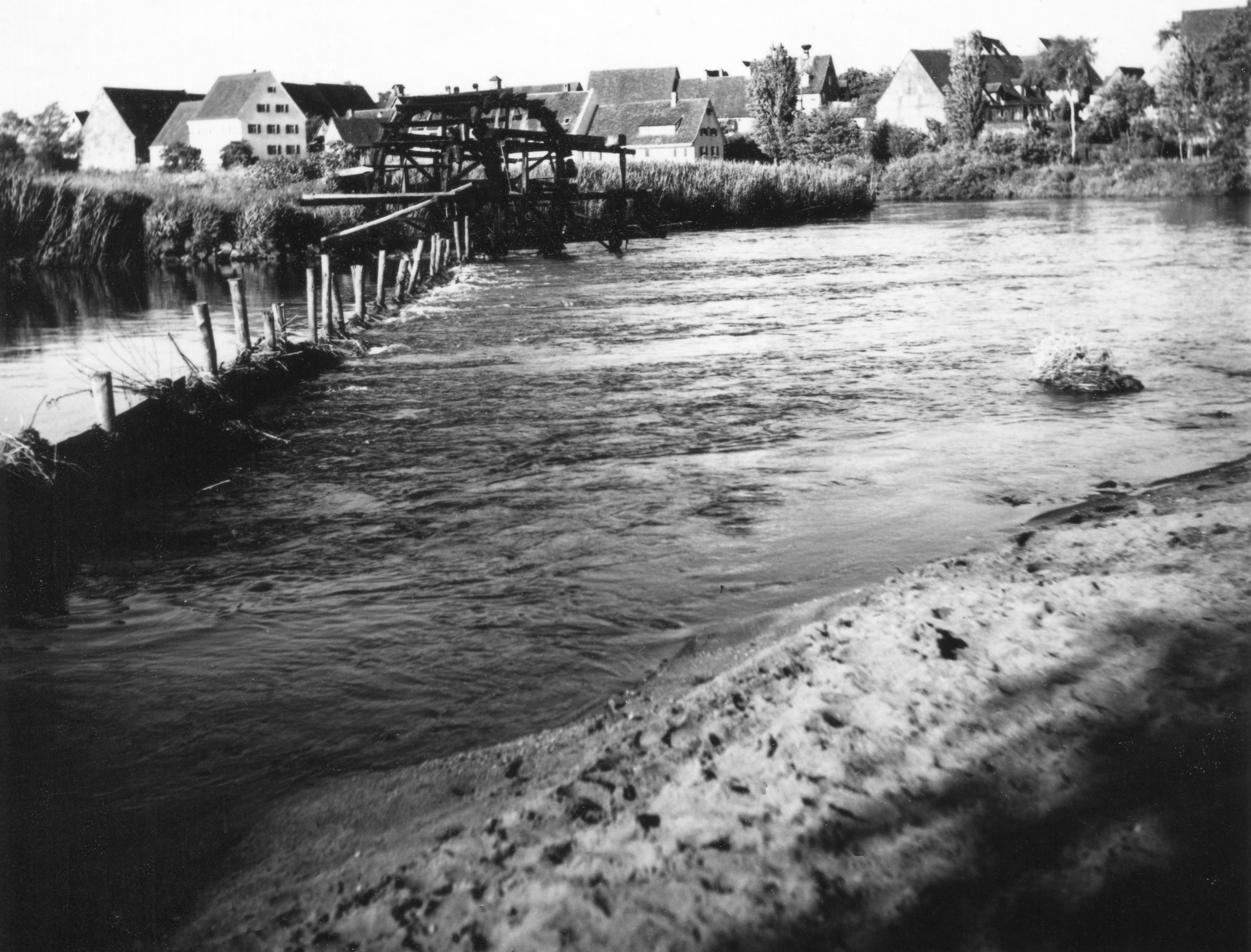 | Beschreibung | Ein Wasserschöpfrad gegenüber der Sandflösse in Stadeln, Aufnahme von 1936 – im Hintergrund links Bauernhof Fischerberg 10, Bildmitte das Fischerhaus Fischerberg 22 und rechts die Gebäude an der unteren Romminggasse | ||