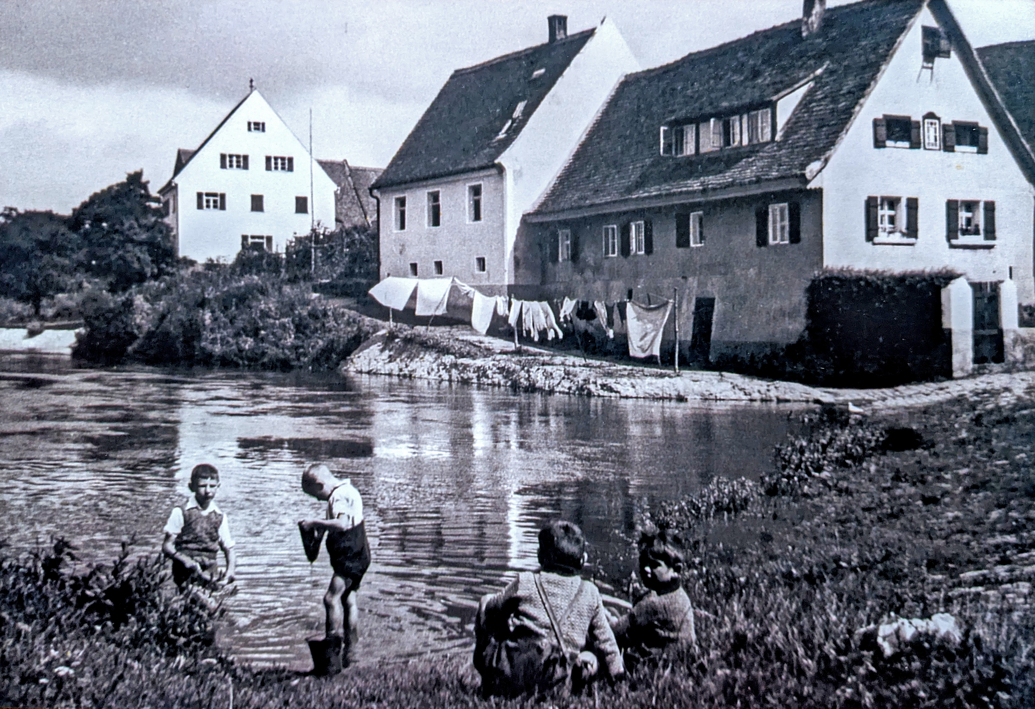 | Beschreibung | Stadelner Kinder beim "Gründeli-Fischen" in der Regnitz, vermutlich in den 1950er Jahren | ||