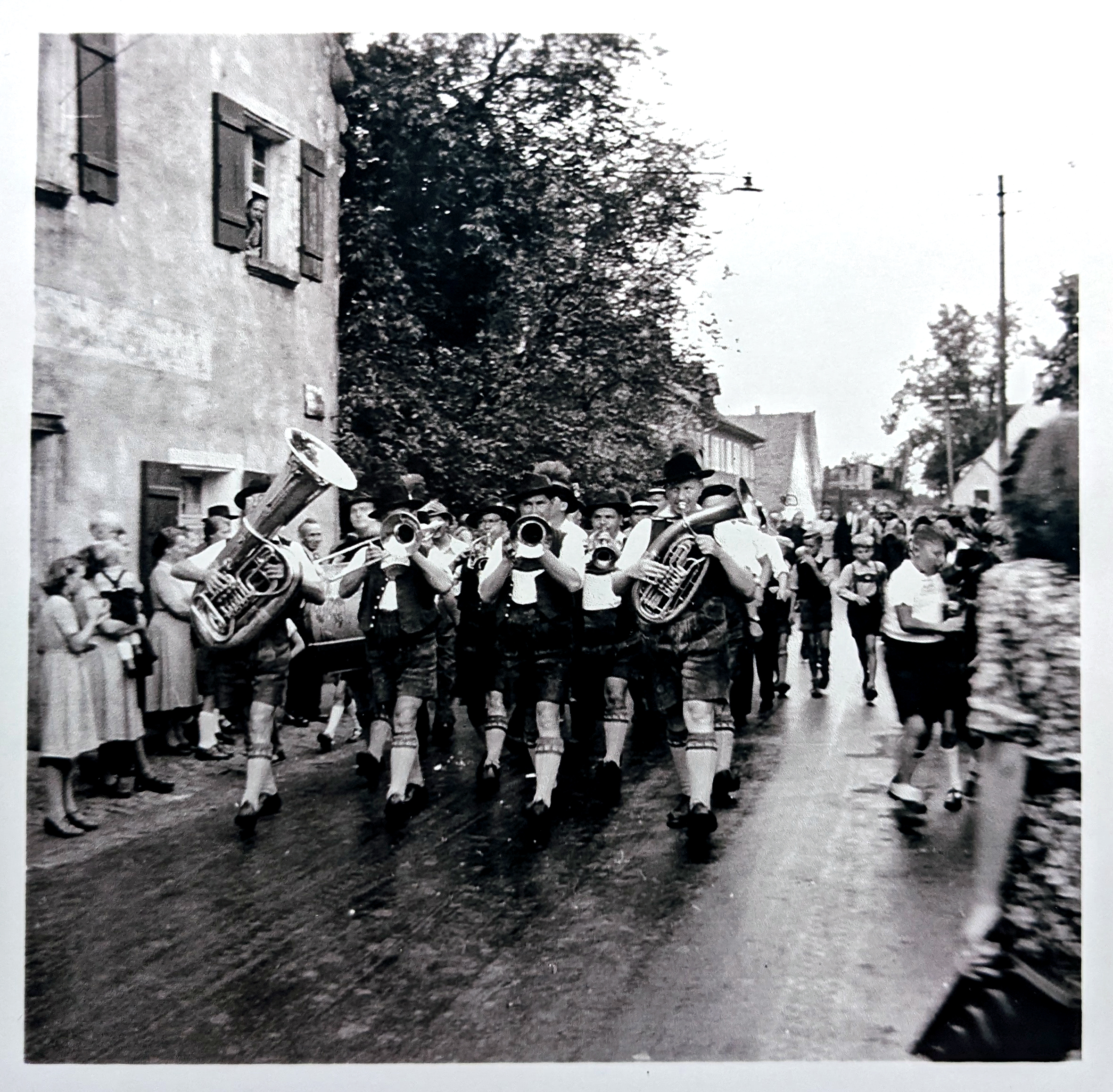 | Beschreibung | Abholen der Kärwaburschen zum Betzen-Tanz am Kärwamontag, links die Ulrichs-Wirtschaft mit Biergarten in Stadeln, 1947 | ||