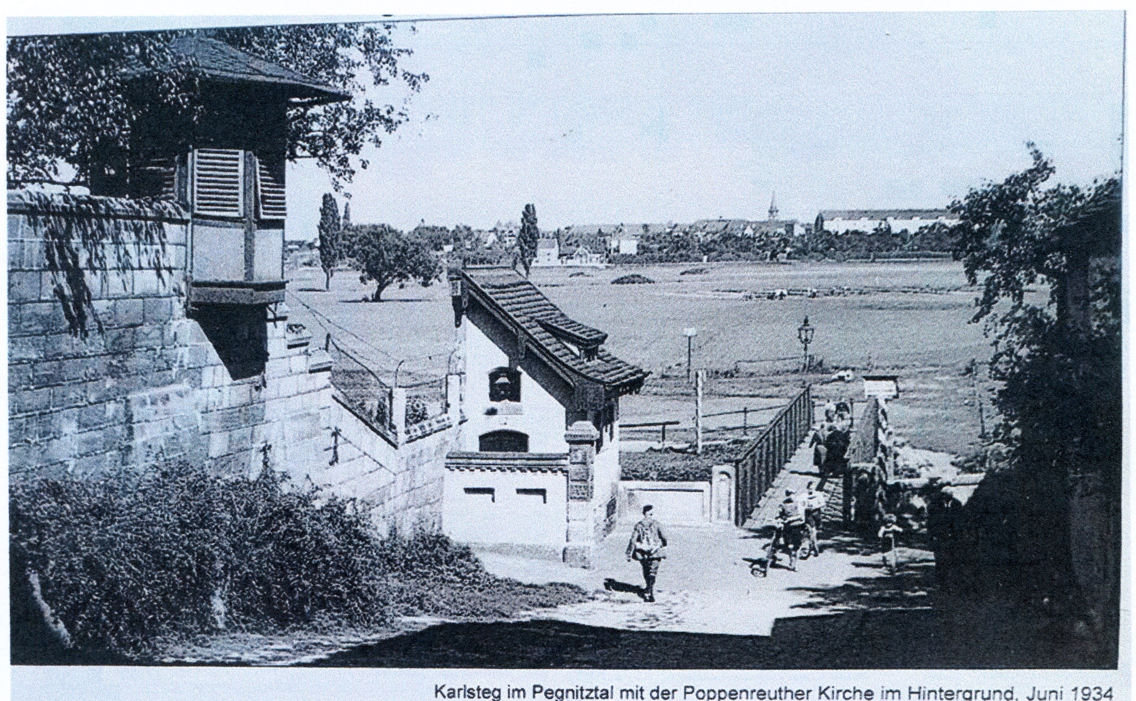 | Beschreibung | Ansichtskarte vom alten Karlsteg mit Blick in den Wiesengrund, links die ehem. Bedürftnisanstalt, Juni 1934 | ||