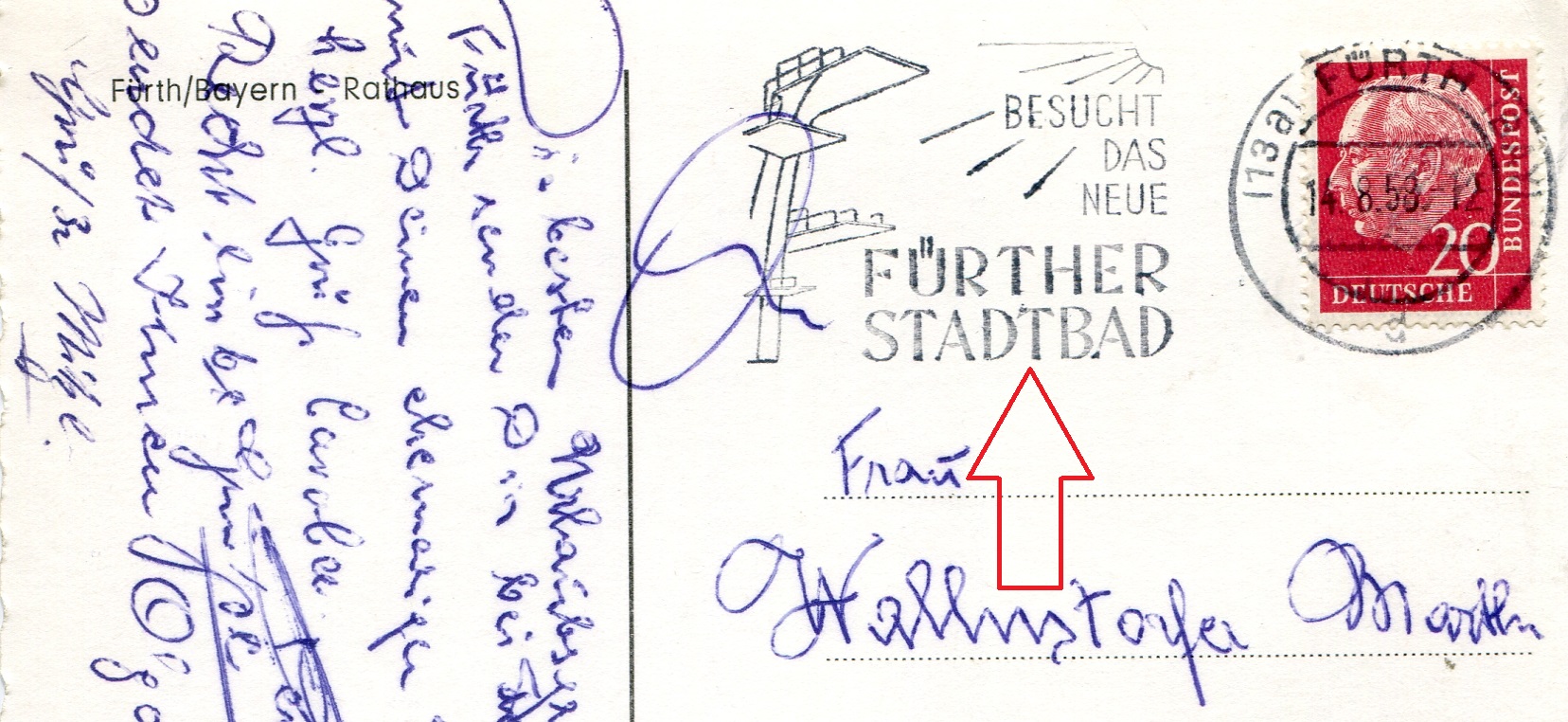 | Dateiinfo (Bild-Unterschrift und Info-Box, automatisch erstellt) | Frankier Postwerbestempel über das neue Freibad von 1958 Lizenz: CC BY-SA 4.0 | ||