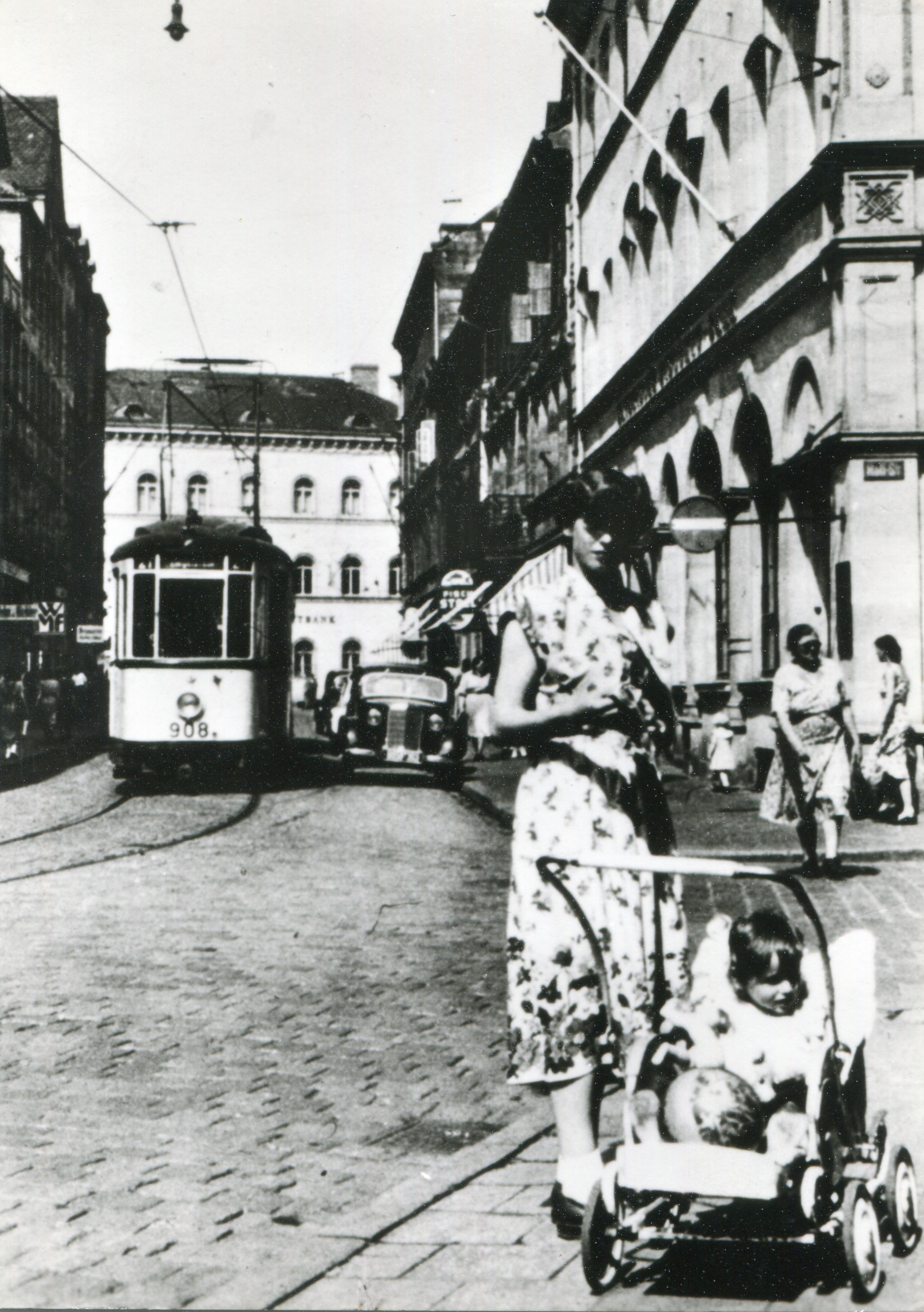| Beschreibung | Ansichtskarte Straßenszene Rudolf-Breitscheid-Straße mit Einmündung Hallstraße dahinter ehem. Commerzbank Gebäude, hinter der Straßenbahn 21er TW 908 DÜWAG Bj. 1940 und Mercedes 170 V Bankgebäude Schwabacher Straße 32, links Firmenschild WMF in Haus Nr. 2, nicht gelaufen, 1952 | ||