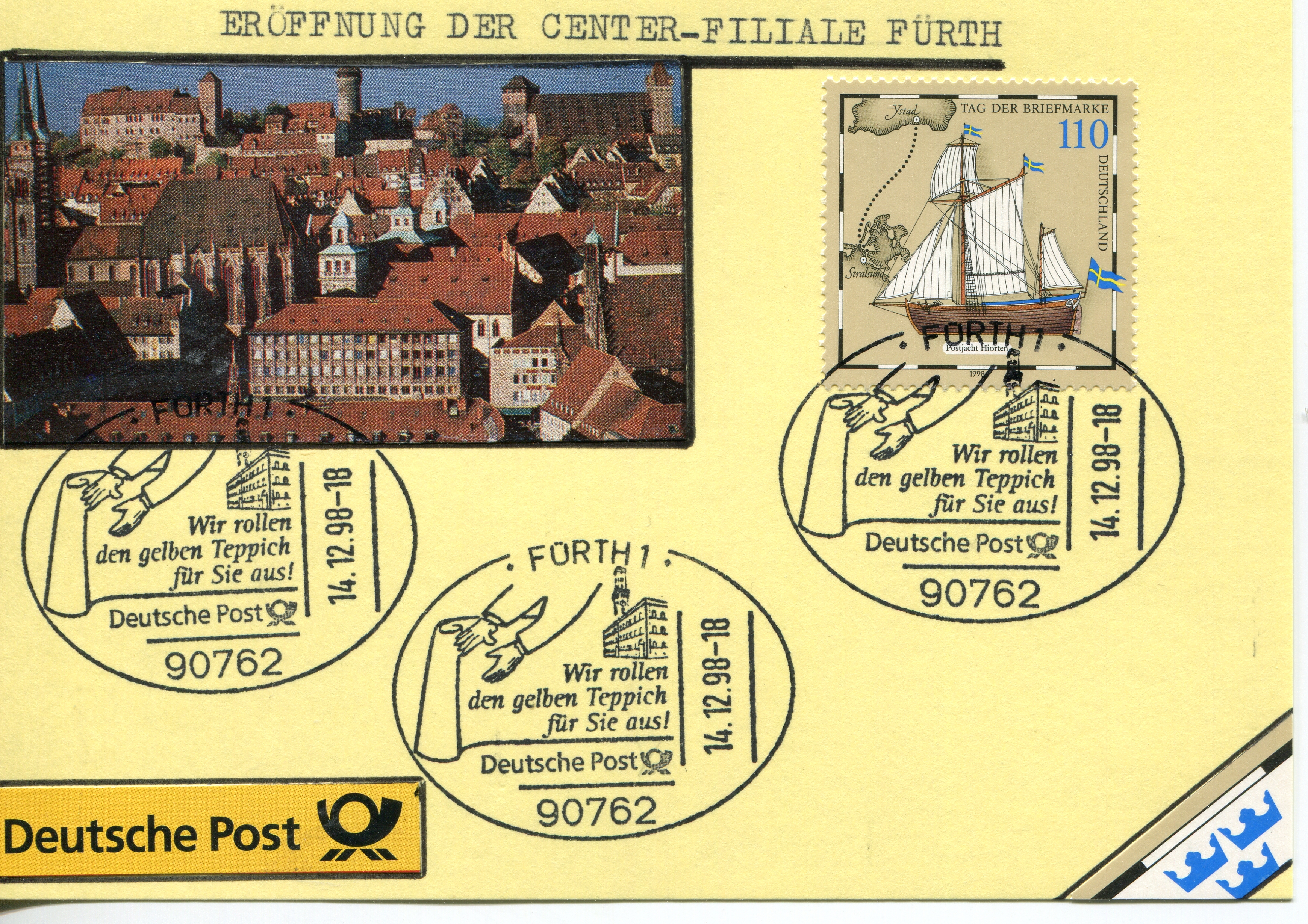 | Beschreibung | Sonderstempel Fürth 1 zur Eröffnung der "Center-Filiale Fürth" mit Nürnberger Stadtfoto, 14. Dezember 1998 | ||