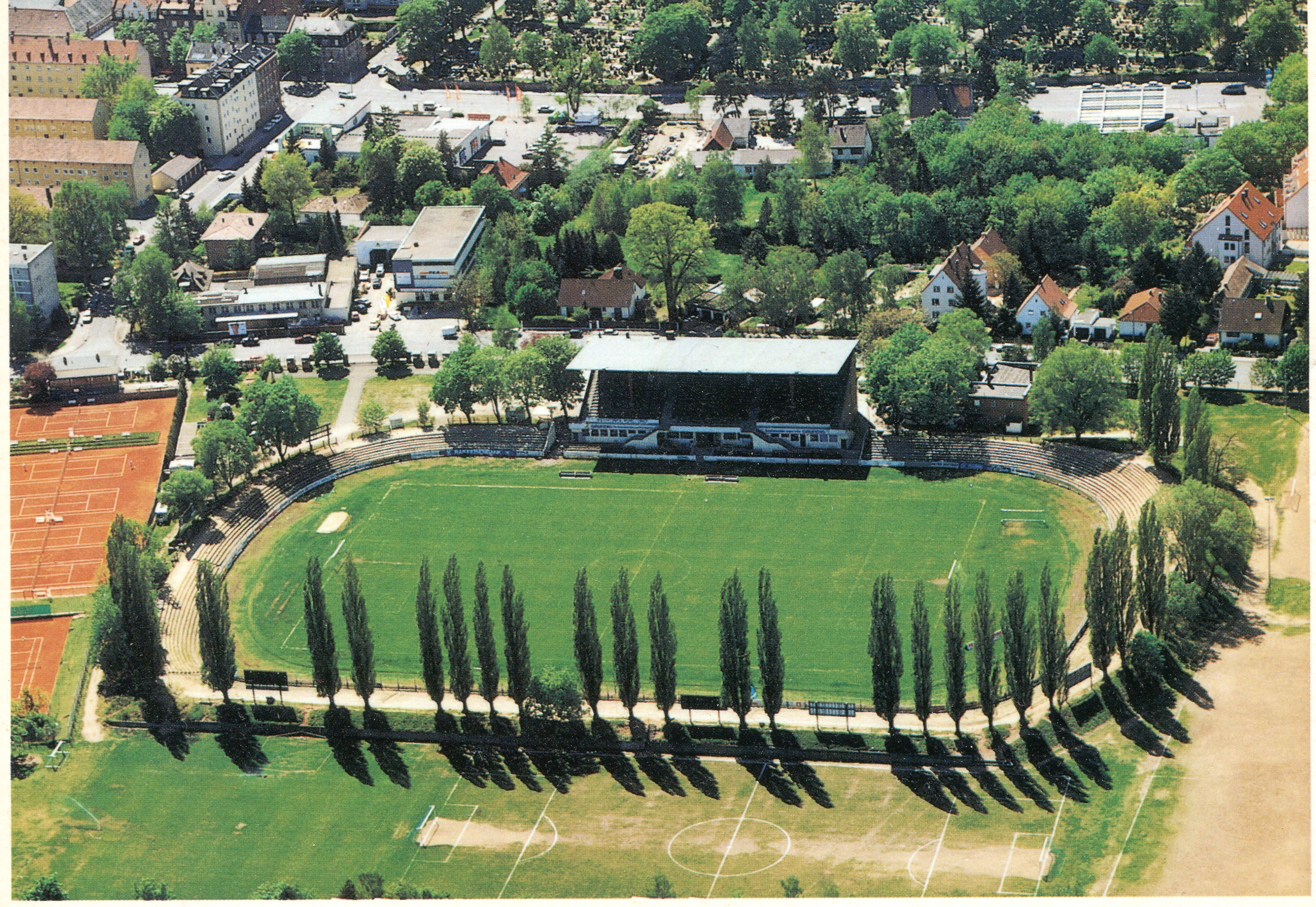 | Dateiinfo (Bild-Unterschrift und Info-Box, automatisch erstellt) | Ansichtskarte Kuftbild vom SpVgg Gelände mit Laubenweg, Mauerstraße und Erlanger Straße, oben Teil ... Ansichtskarte Kuftbild vom SpVgg Gelände mit Laubenweg, Mauerstraße und Erlanger Straße, oben Teil vom Friedhof, Aufnahme vom 3. Mai 1994<br>Urheber: Stadionansichtskartenverlag Schulz Schwarzenberg Foto Bischof+Broel 1994<br><br>Lizenz: CC BY-SA 3.0 | ||