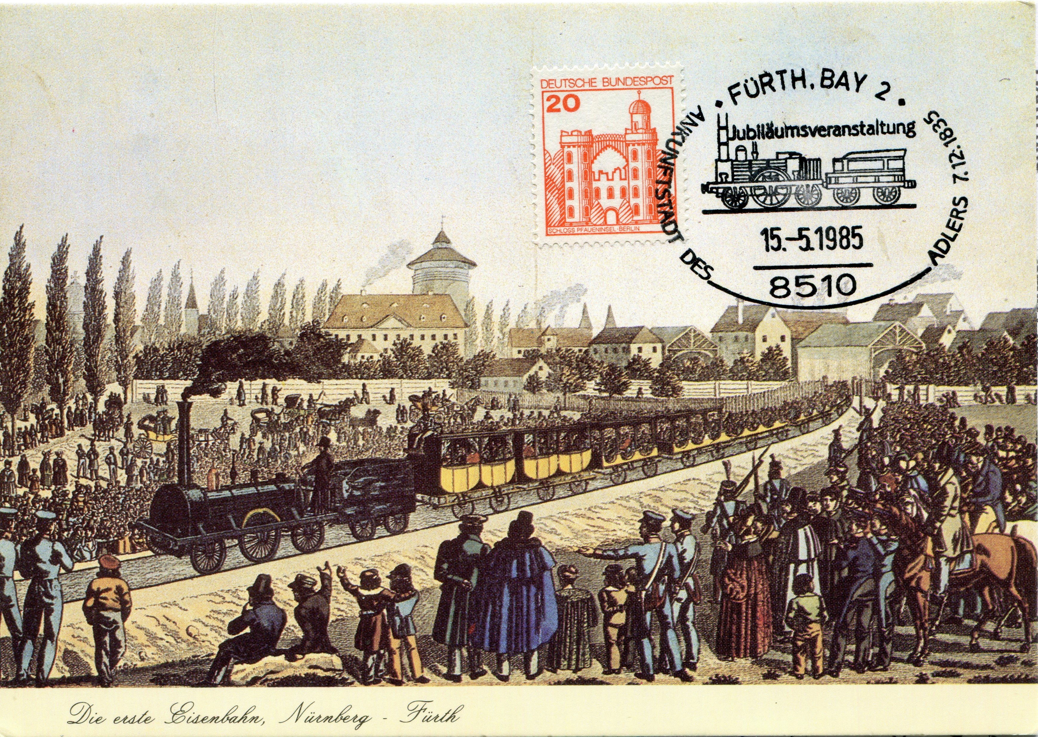 | Beschreibung | Ansichtskarte mit Sonderstempel 150 Jahre Ludwigseisenbahn vom 15. Mai 1985 | ||