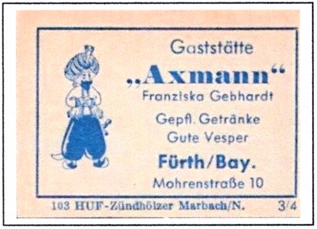 | Beschreibung | Zündholzschachtel-Etikett der ehemaligen Gaststätte "Axmann" in der Mohrenstraße 10 (ehemals), um 1965 | ||