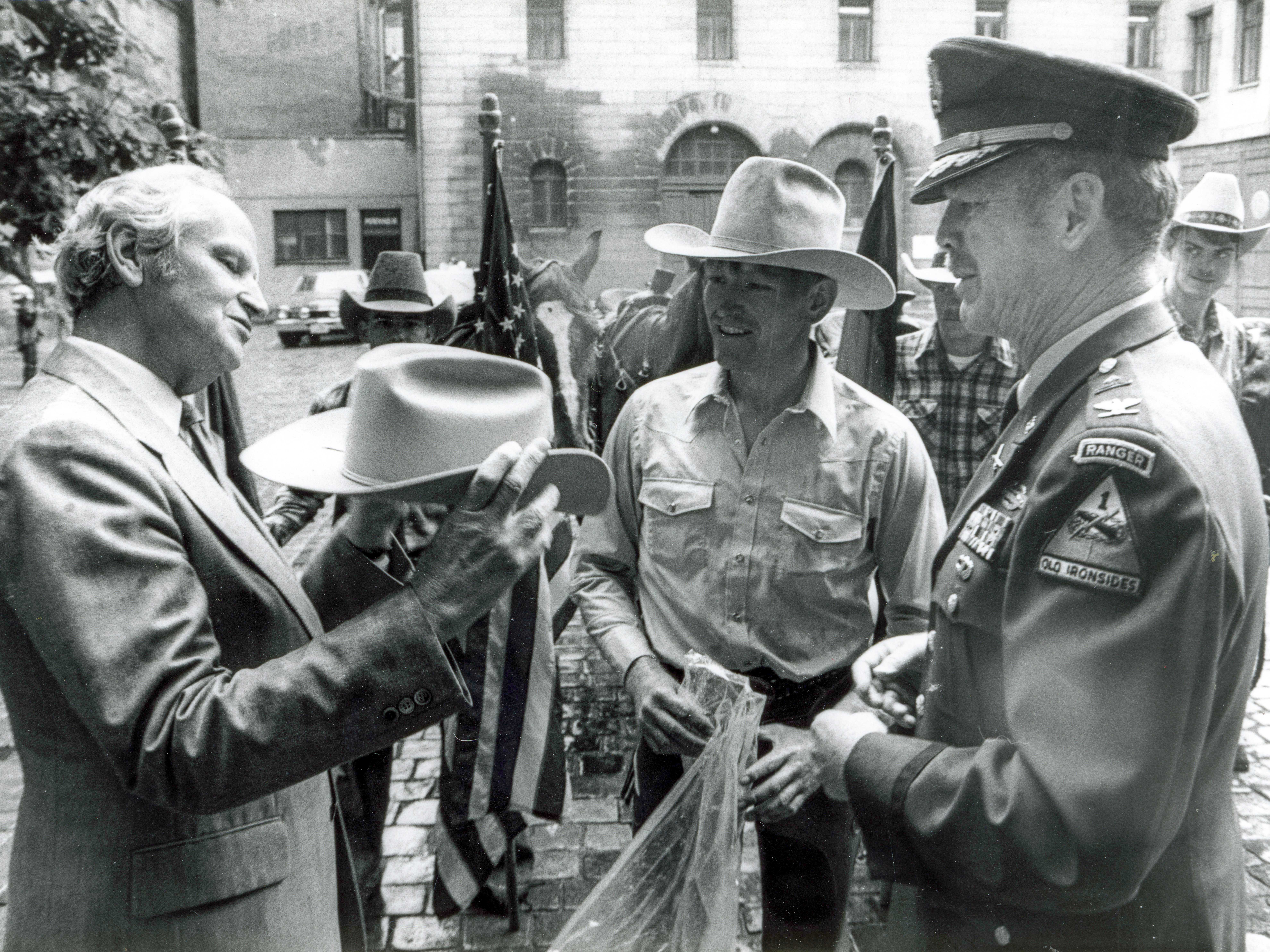 | Beschreibung | OB Kurt Scherzer mit Mitgliedern der U.S. Army im Rathausinnenhof, Juni 1982 | ||