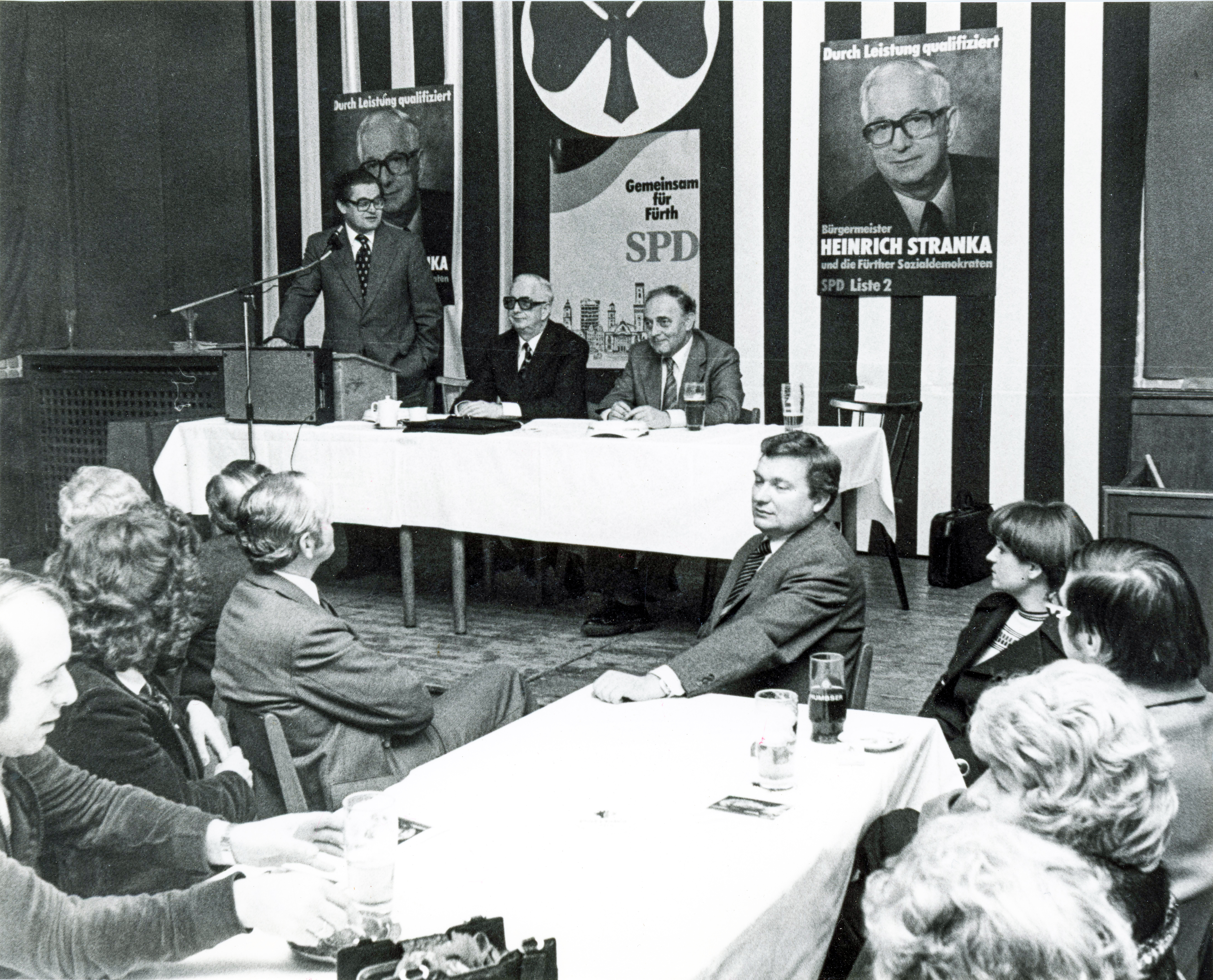 | Beschreibung | SPD-Bürgermeisterwahlkampfveranstaltung 1978 für Heinrich Stranka mit Friedrich Engel (re. vom BM auf der Bühne), im Vordergrund auch OB Kurt Scherzer, 1978 | ||