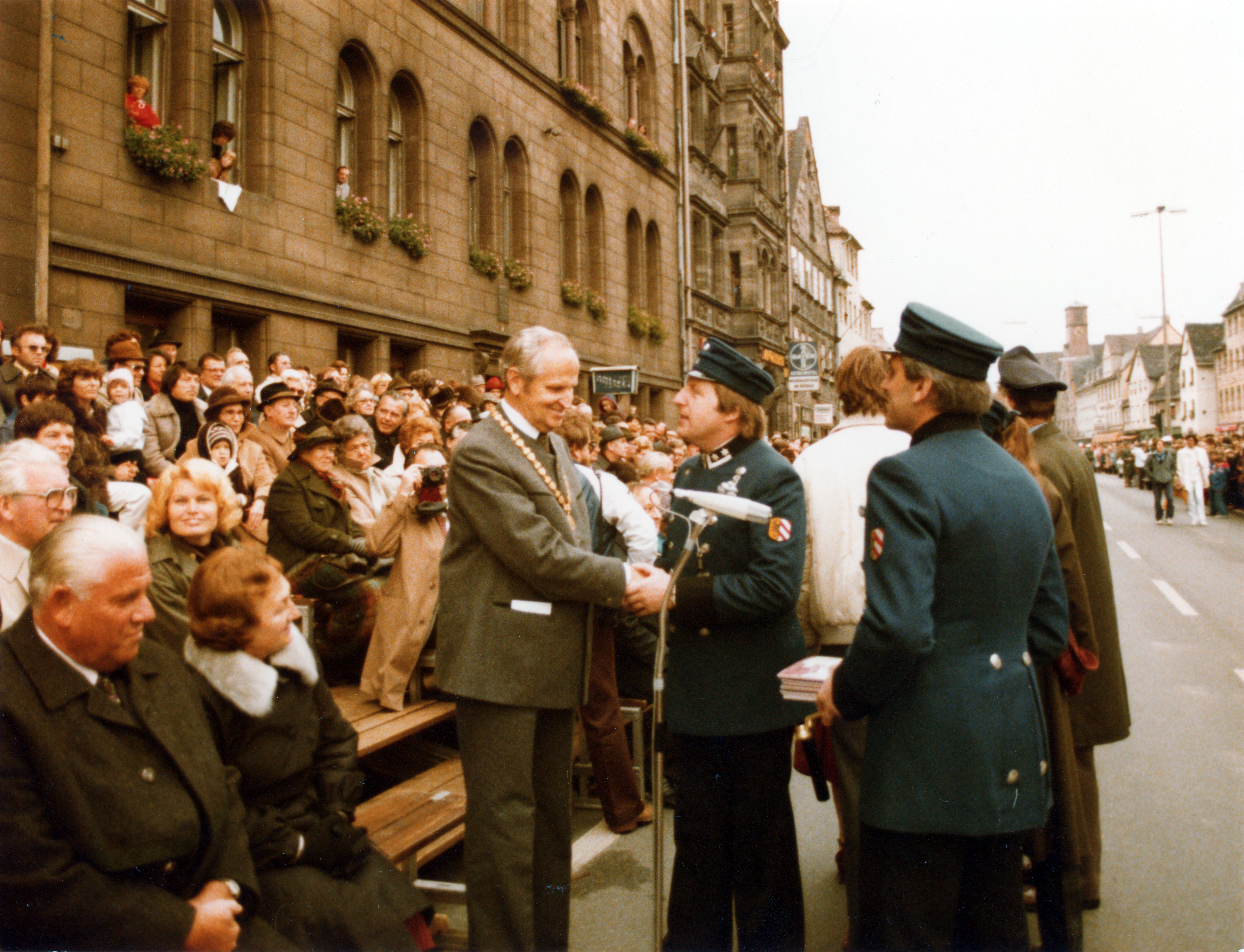 | Beschreibung | OB Kurt Scherzer am Bauernsonntag zur Michaeliskirchweih - links im Bild der Nürnberger OB Urschlechter, Okt 1980 | ||