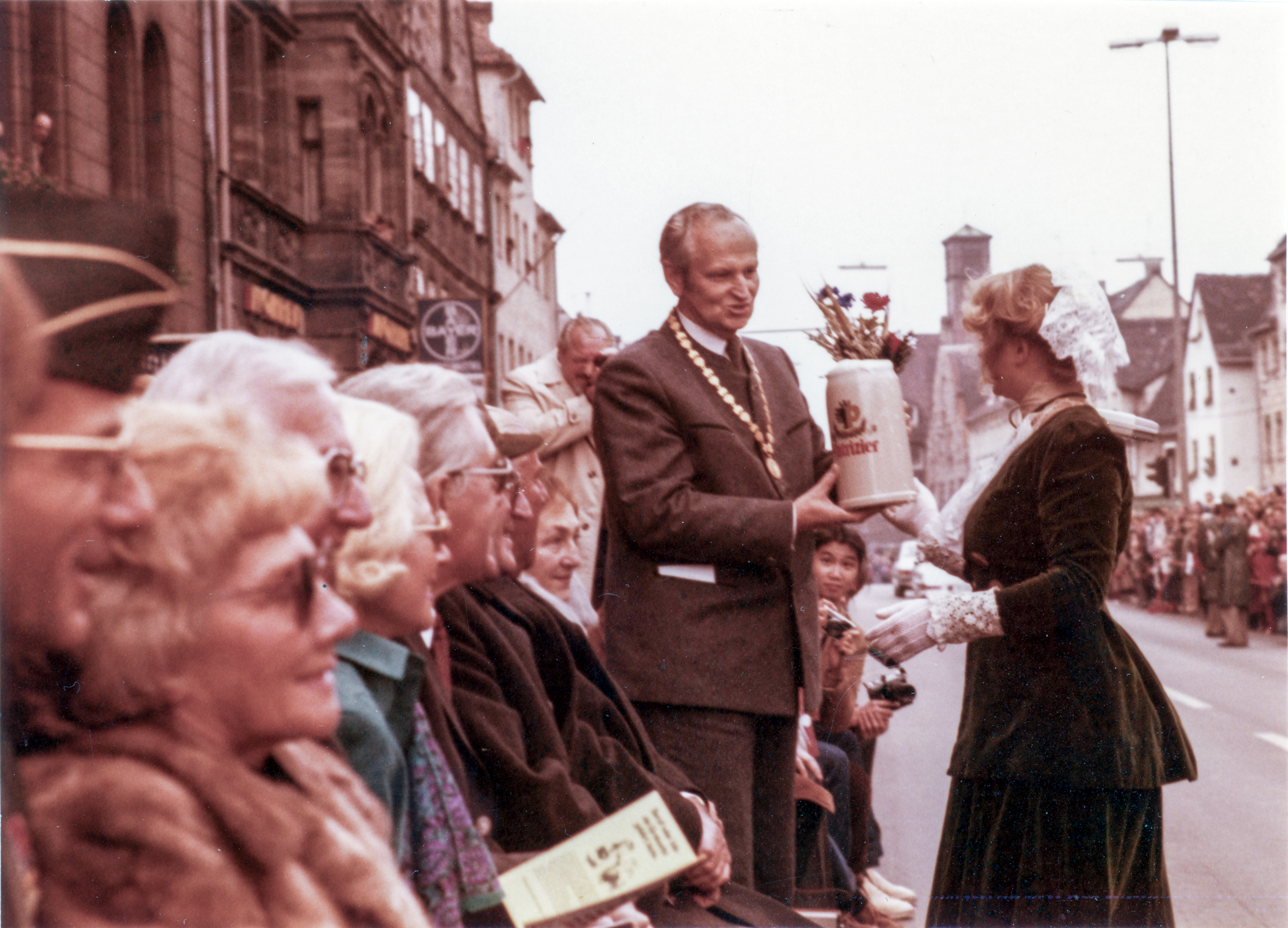 | Beschreibung | OB Kurt Scherzer am Bauernsonntag zur Michaeliskirchweih, Okt 1980 | ||