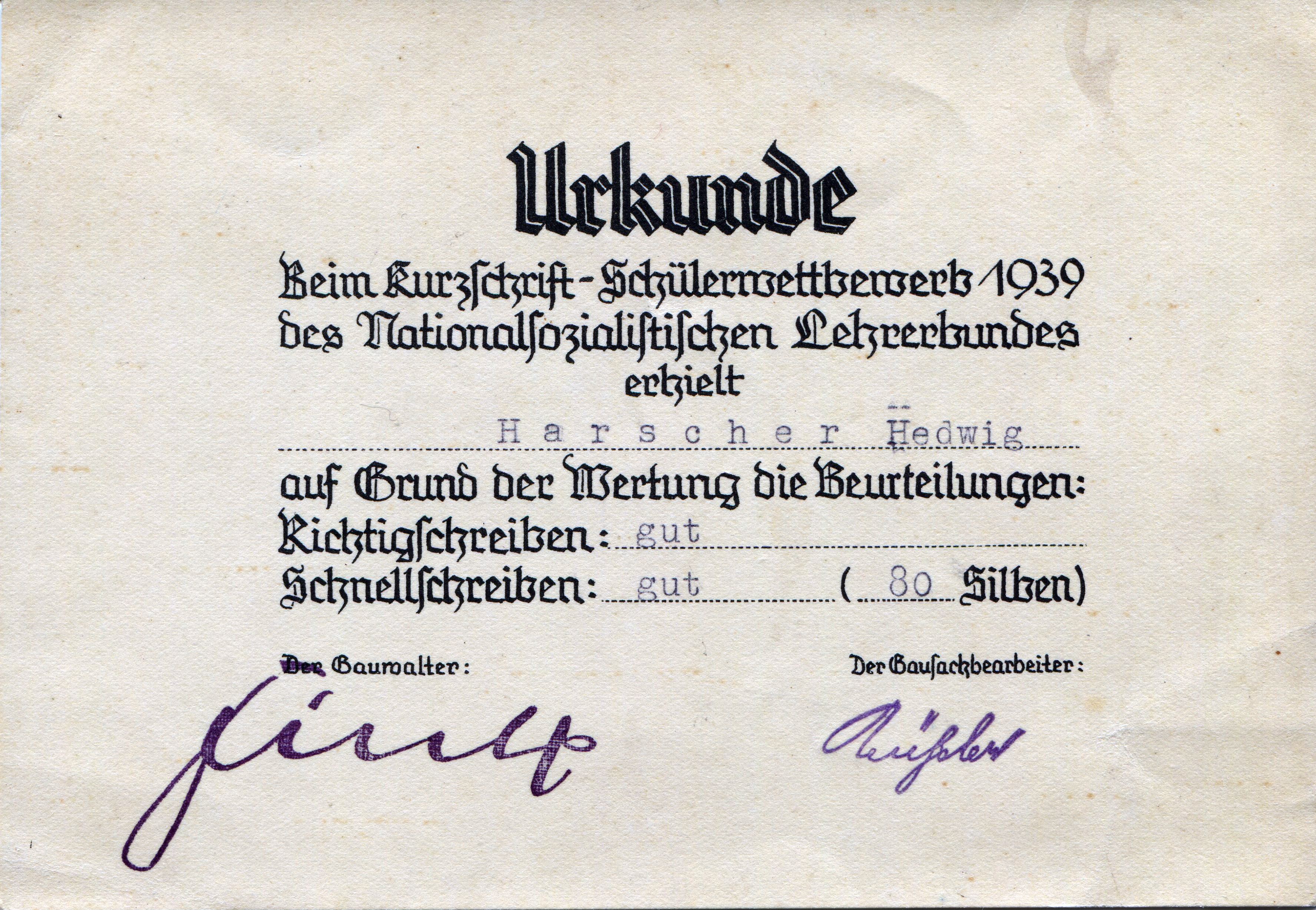 | Beschreibung | Urkunde für Kurzschrift-Schülerwettbewerb des NS-Lehrerbundes Gau Franken, 1939 | ||