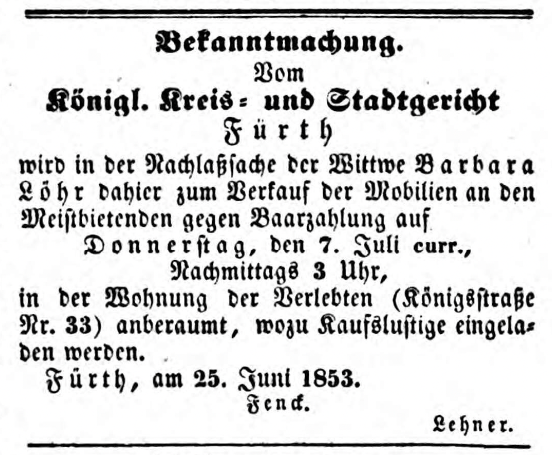 | Dateiinfo (Bild-Unterschrift und Info-Box, automatisch erstellt) | Versteigerung von Nachlass der Maurermeisterswitwe Barbara Löhr, Juli 1853 Lizenz: NoC-NC 1.0 | ||
