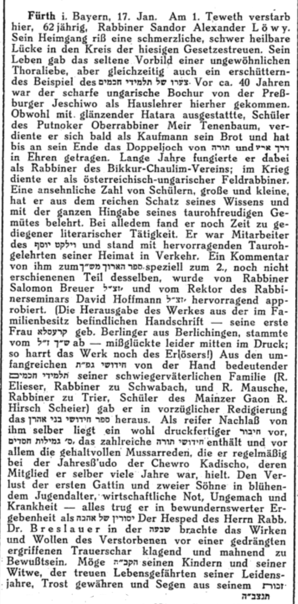 Datei:Nachruf Sandor Alexander Löwy, Der Israelit 1. Februar 1934.png