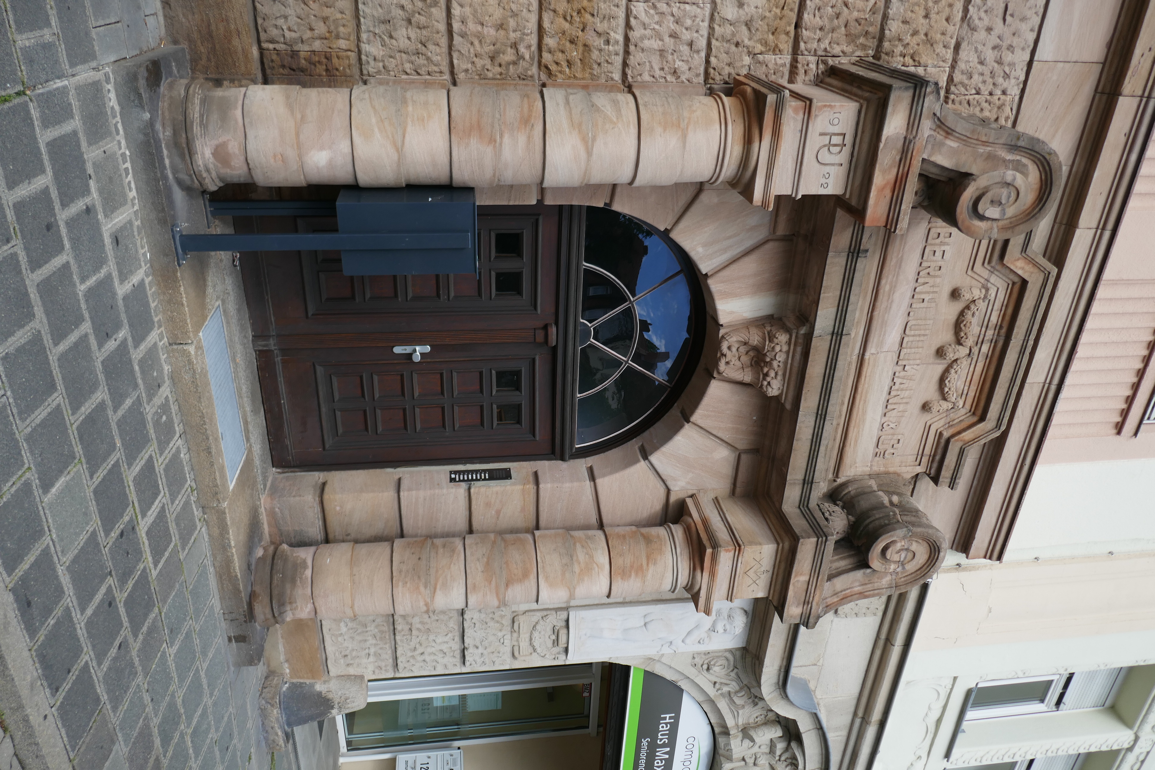 | Beschreibung | Säulenportal am Verwaltungsgebäude der ehem. Bronzefabrik Bernhard Ullmann in der Nürnberger Straße, 2020 | ||